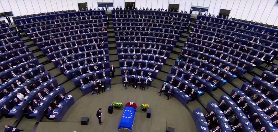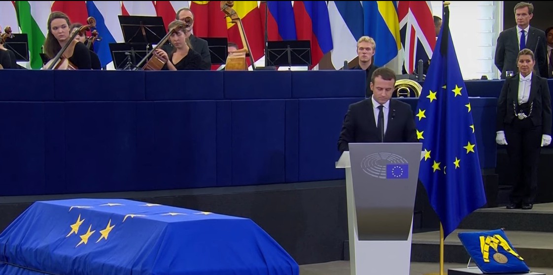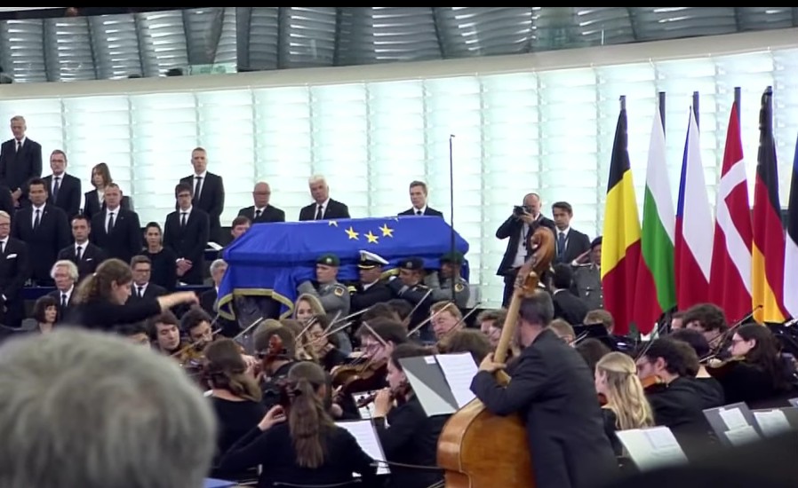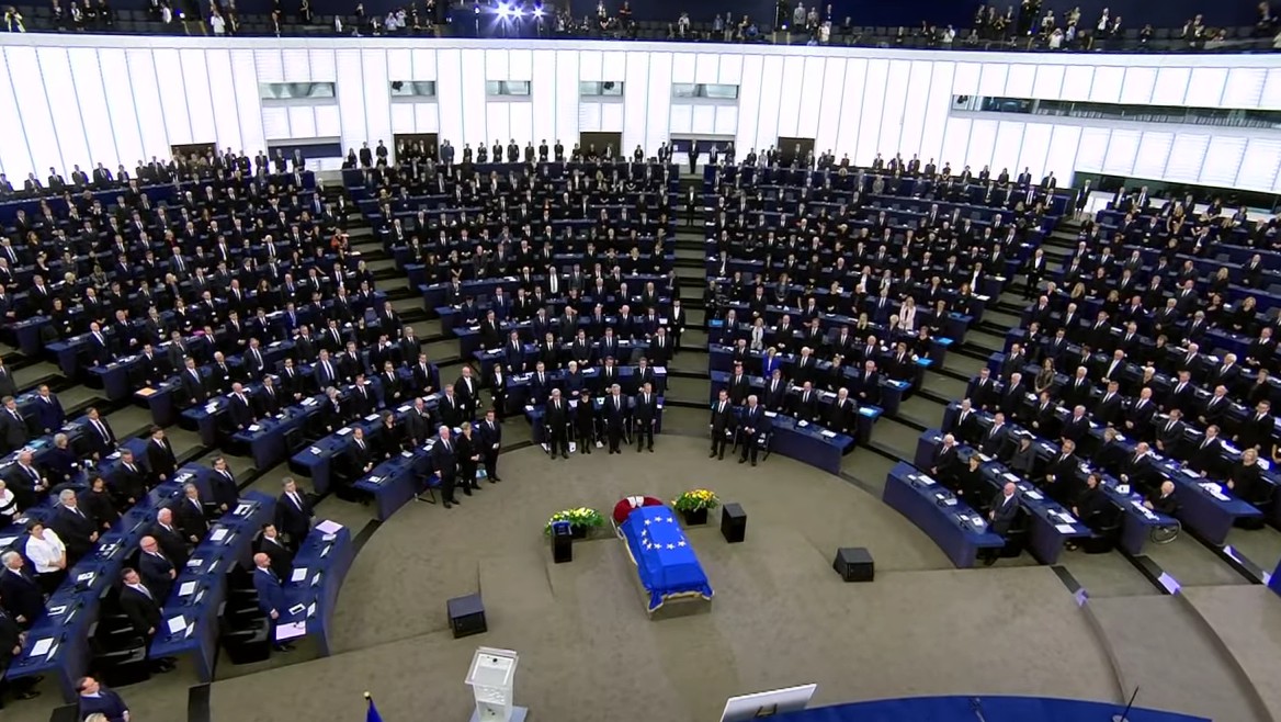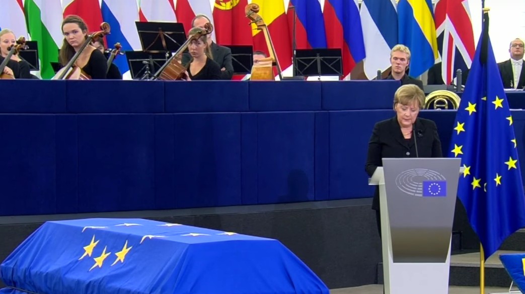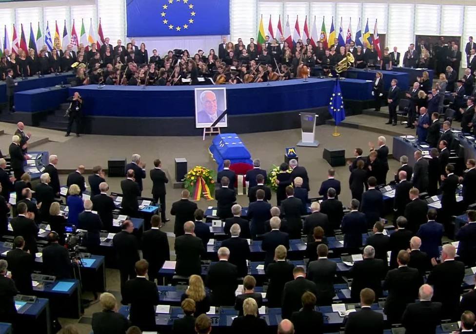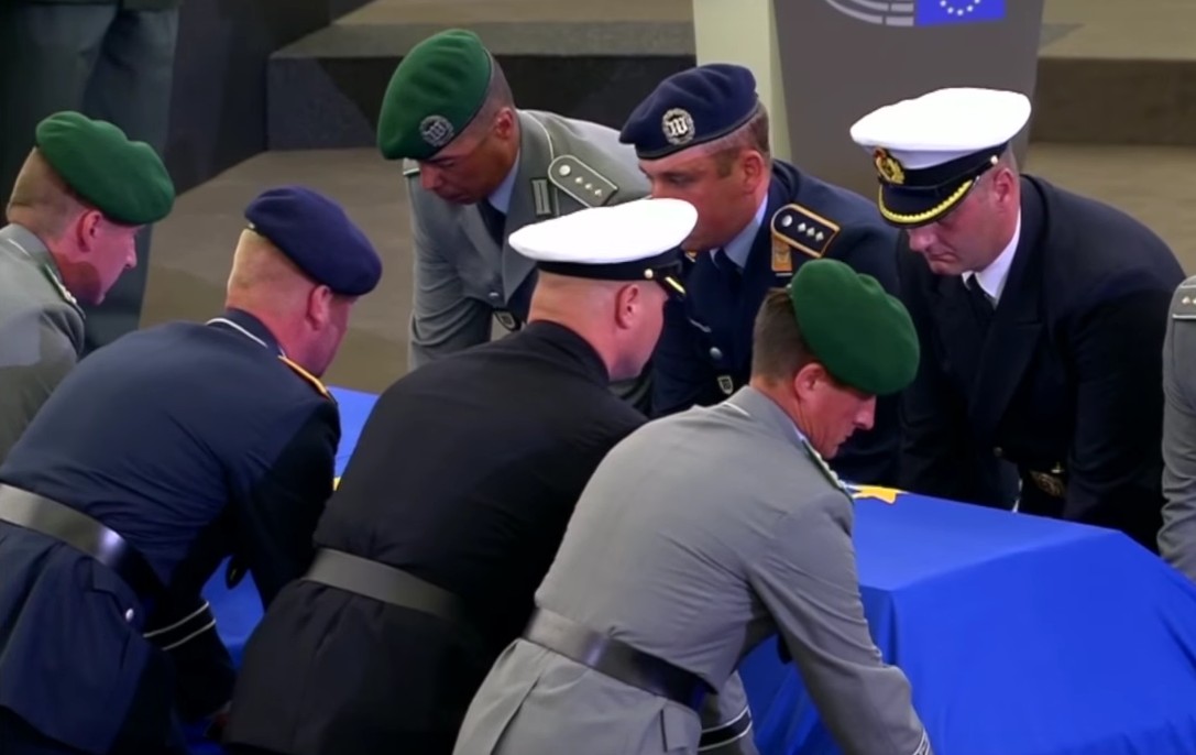 Le cercueil recouvert du drapeau européen et porté par huit militaires allemands a été installé sur un catafalque érigé au centre de l’hémicycle pour cette cérémonie sans précédent dans l’histoire de l’Union européenne.
