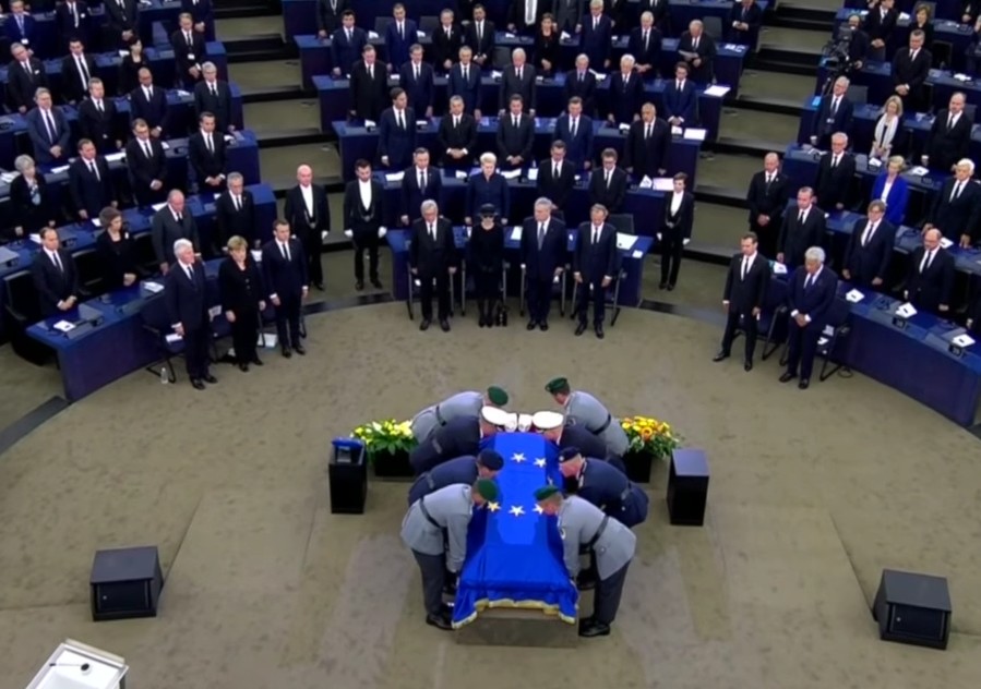 Le cercueil, recouvert du drapeau européen et porté par huit militaires allemands, a été installé sur un catafalque érigé au centre du Parlement européen à Strasbourg.