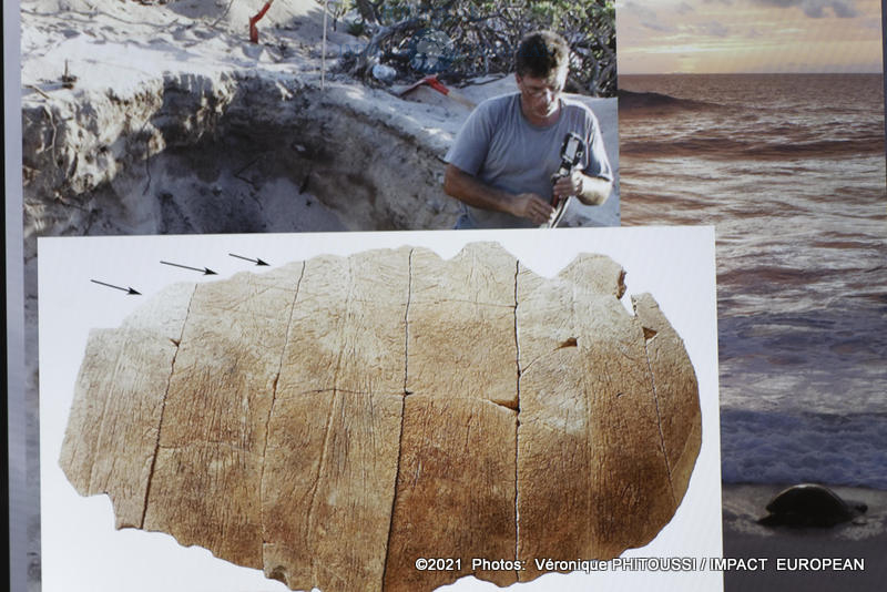 Les tortues ont une fine couche de kératine sur le dos, des traces de marques sur le dos des tortues furent trouvées car les naufragés tiraient les tortues sur le dos afin de les vider de leur chair, d’autres marques furent trouvées à l’intérieur de la coque montrant que les naufragés débitaient la chair (photo 12).