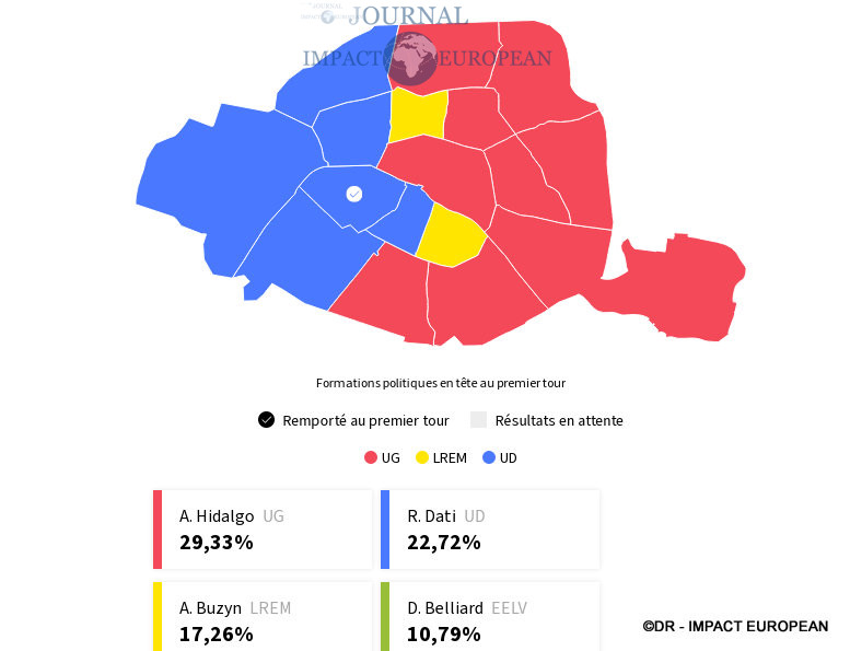 La maire sortante Anne Hidalgo arrive largement en tête avec plus de 31% des voix, selon une première estimation. Rachida Dati obtiendrait 22% et Agnès Buzyn 17%.