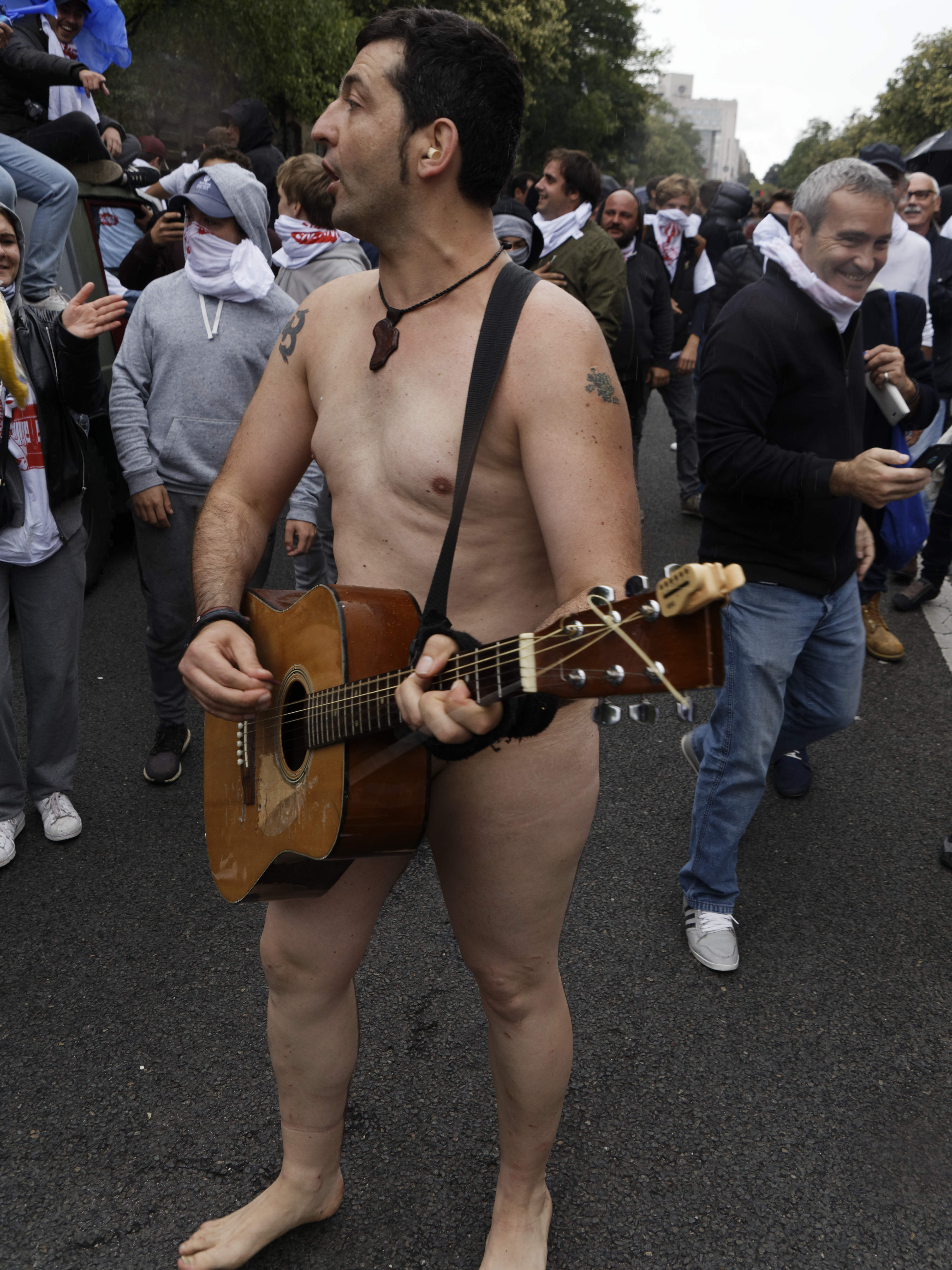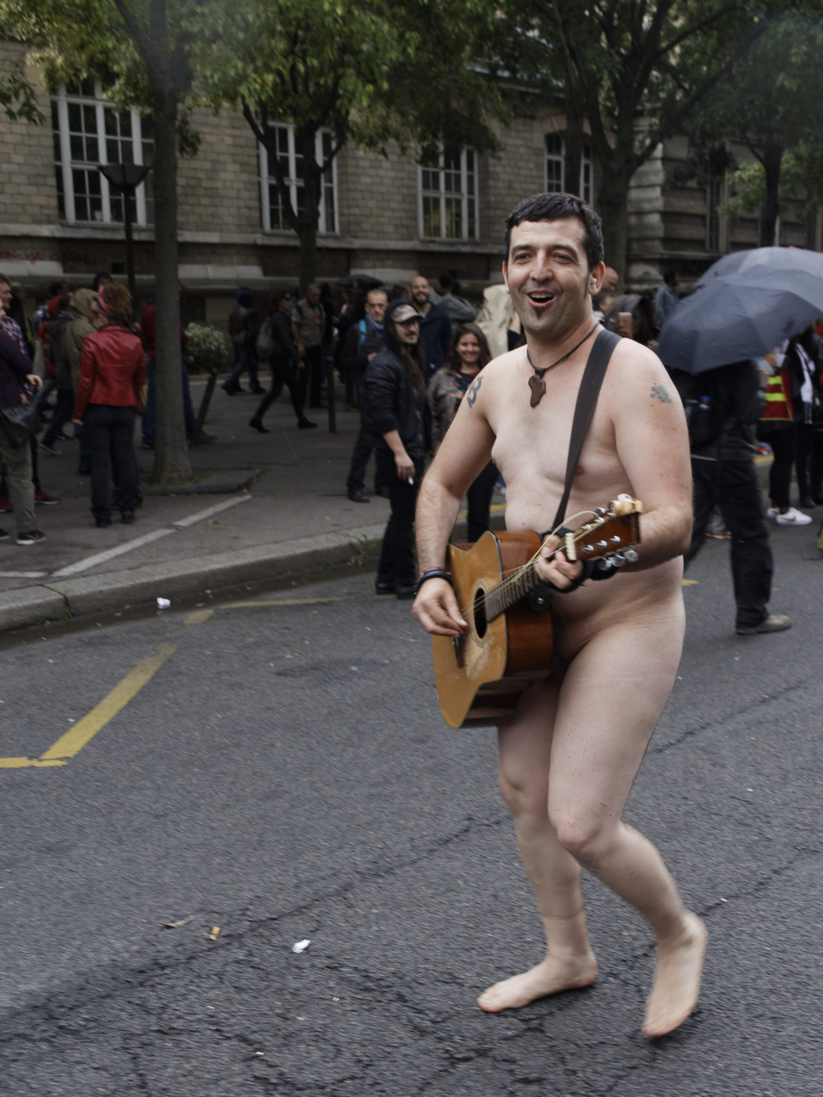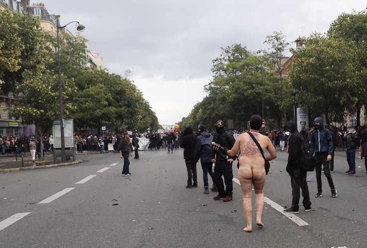 A Paris, le 12 septembre, alors que la manifestation contre la réforme du code du travail était en passe de dégénérer et que les forces de l’ordre tiraient au flashball en réponse aux projectiles lancés par des individus cagoulés. Soudain un homme est arrivé, nu, en jouant de la guitare.