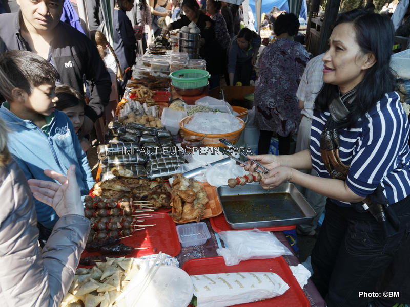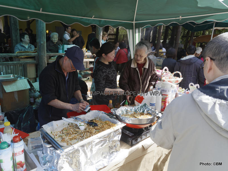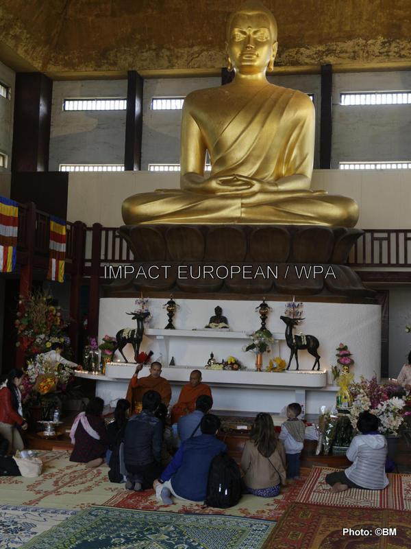 A l’extérieur du temple, on trouvait différents stands (vêtements, objets artisanaux, nourriture, associations venant en aide aux pays d’Asie ainsi qu’une scène avec des danses traditionnelles et des musiques plus ou moins modernes. Toutes ces activités ont eu lieu l’après midi alors qu’une cérémonie religieuse s’est tenue dès 10h avec la récitation du Paritta pour invoquer des protections, l’érection des Monts de sables, les offrandes de l’eau parfumée au Bouddha, les offrandes d’aumônes et la transmission des mérites. A 11h, les offrandes au Triple Joyau, les 3 piliers sur lesquels a été fondé le bouddhisme soit Bouddha qui a atteint le Nirvana, Dharma qui constitue l’enseignement de Bouddah et Sangha qui représente la communauté des adeptes.