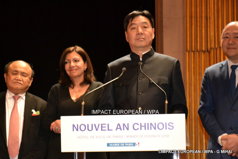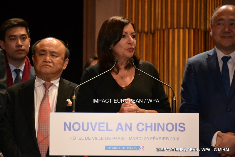 L’estrade surplombée d’un chien, signe de l’année a accueilli la Maire de Paris et l’ambassadeur de Chine en France qui ont fait un discours relatant la longue amitié entre les deux pays mais aussi la présence des ressortissants d’origine chinoise qui ont marqué l’histoire tant par leur présence dans l’armée que dans les usines au début du XXème siècle. La maire a salué leur courage et leur discrétion. Il a été aussi question des jeux olympiques puisque Pékin sera la ville hôtes des jeux d’hiver de 2022 après avoir accueilli les jeux de 2008 et Paris celle des jeux de 2024, ce qui sera pour la capitale l’occasion de recevoir des touristes chinois dont le nombre croit chaque année et particulièrement en 2017, la confiance étant revenue.