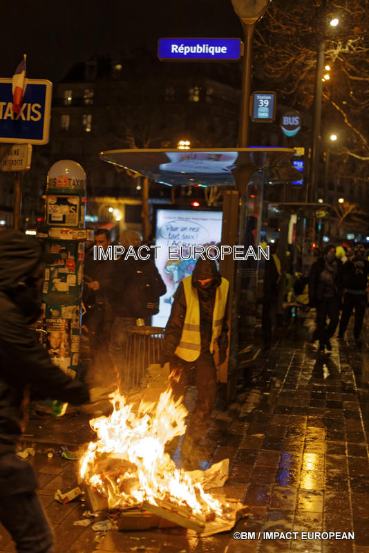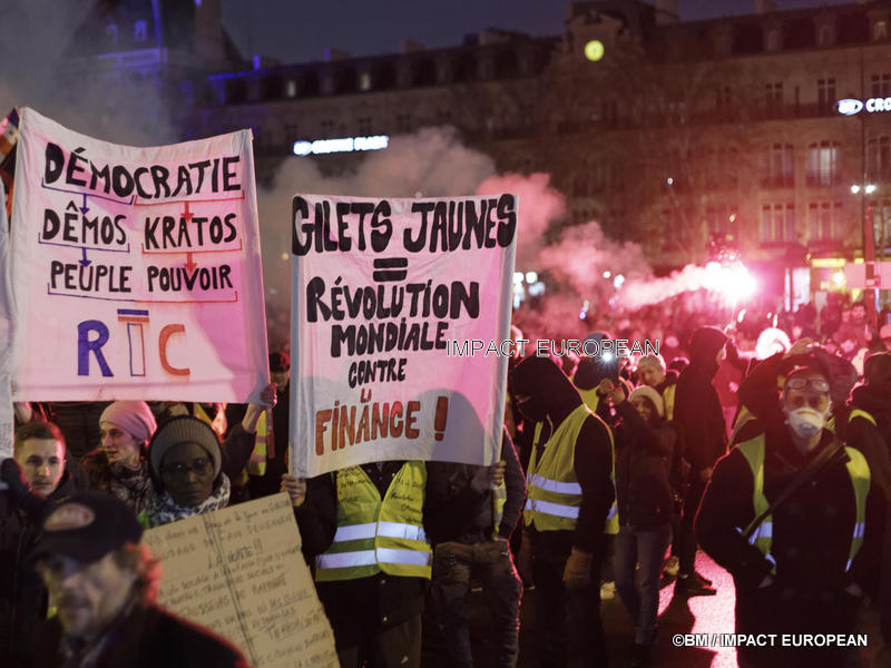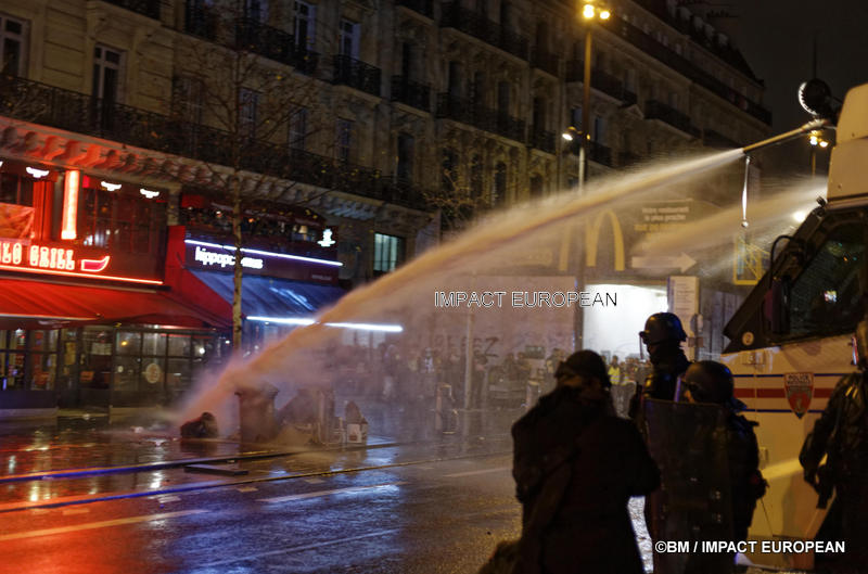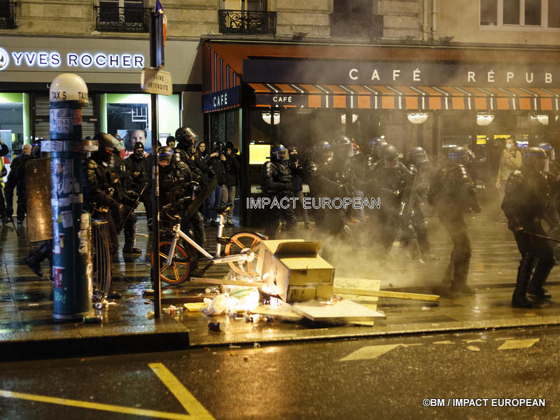 Les forces de l’ordre ont fait usage de gaz lacrymogène, d’un canon à eau et tiré des grenades de désencerclement, repoussant les gilets jaunes sur une partie de la place. De nombreux manifestants se sont plaints d’avoir été évacués de la place alors que le rassemblement, déclaré en préfecture, était autorisé selon eux jusqu’à 22h.