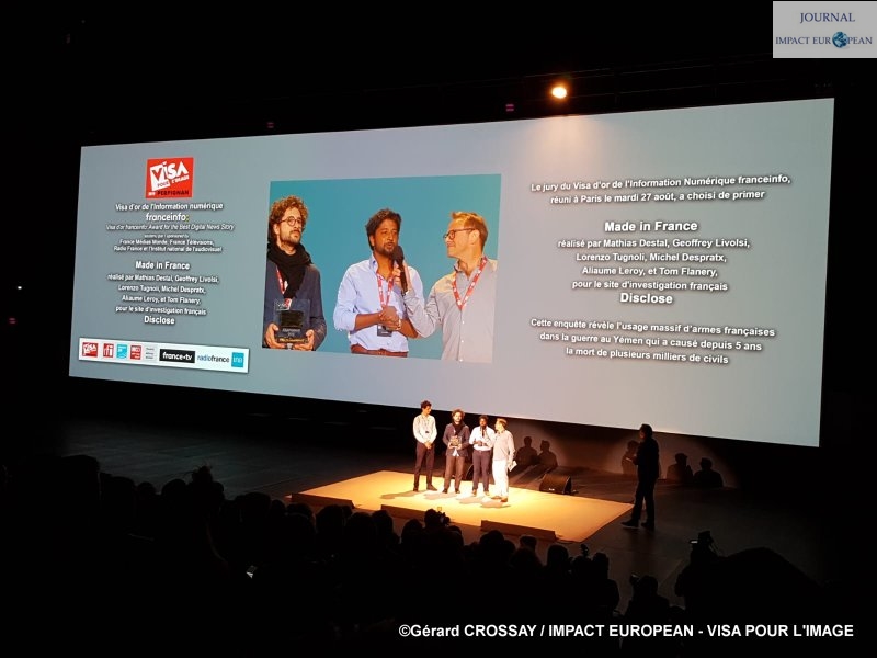Le Visa d’Or de l’Information numérique France Info, soutenu par France Médias Monde (FMM), France Télévisions (FTV), Radio France et l’INA. Le jury a choisi de primer « Made in France » réalisé par Mathias DESTAL, Geoffrey LIVOISI, Lorenzo TUGNOLI, Michel DESPRATX, Allaume LEROY et Tom FLANERY, pour le site d’investigation français DISCLOSE. Cette enquête révèle l’usage massif d’armes françaises dans la guerre au Yémen qui a causé depuis 5 ans la mort de plusieurs milliers de civils.