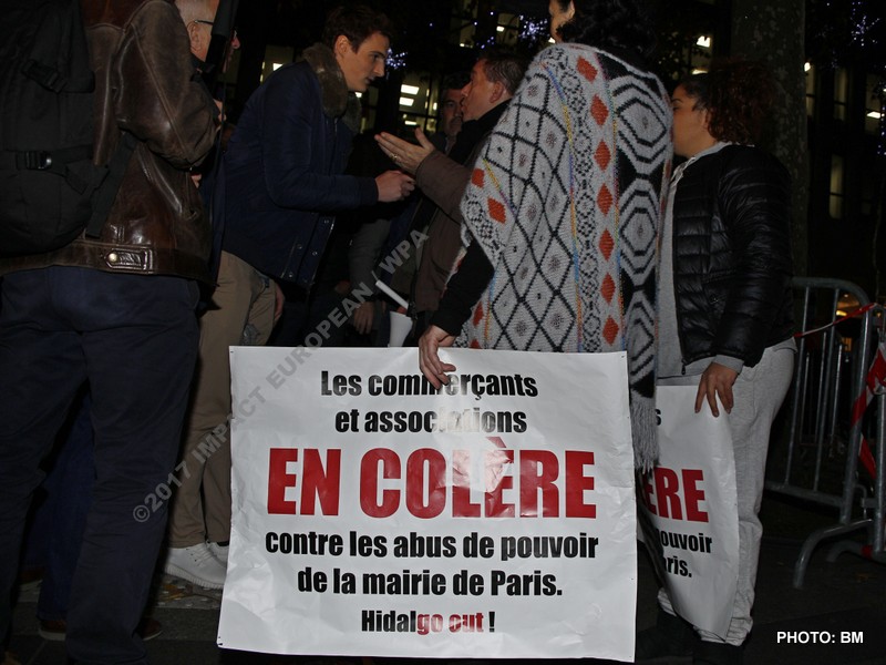 Mais dès l’arrivée de la maire et de plusieurs élus parisiens, des sifflets, huées et klaxons se sont faits entendre. Une centaine de forains et commerçants, rejoints par des salariés de Cyclocity, filiale de JCDecaux en charge des Vélib’ actuellement en grève pour leur emploi, étaient réunis derrière la scène. Les manifestants ont également allumé des fumigènes alors qu’une pluie de confettis envahissait la scène. D’autres manifestants ont également klaxonné et sifflé depuis des voitures roulant sur les Champs-Élysées.