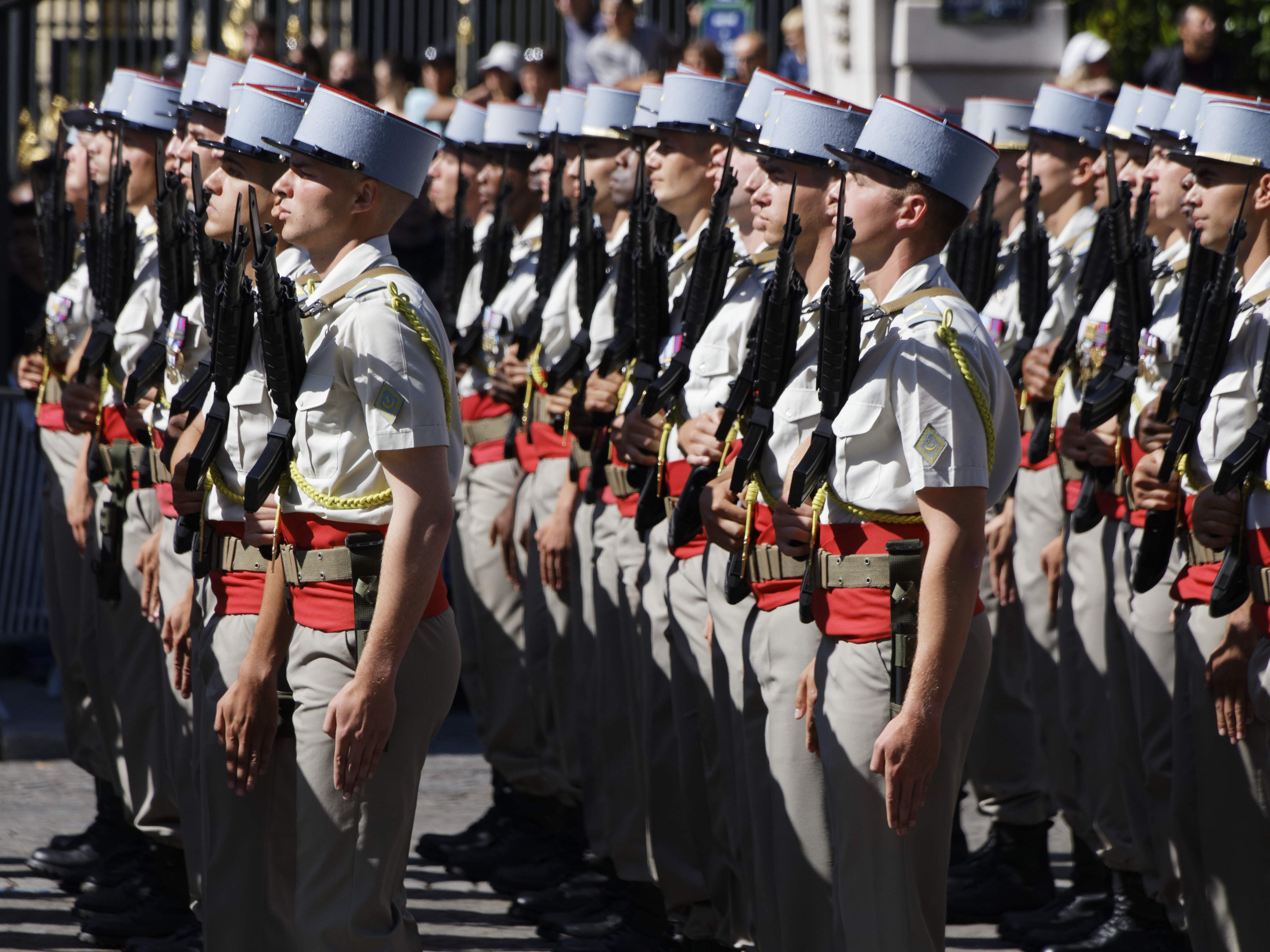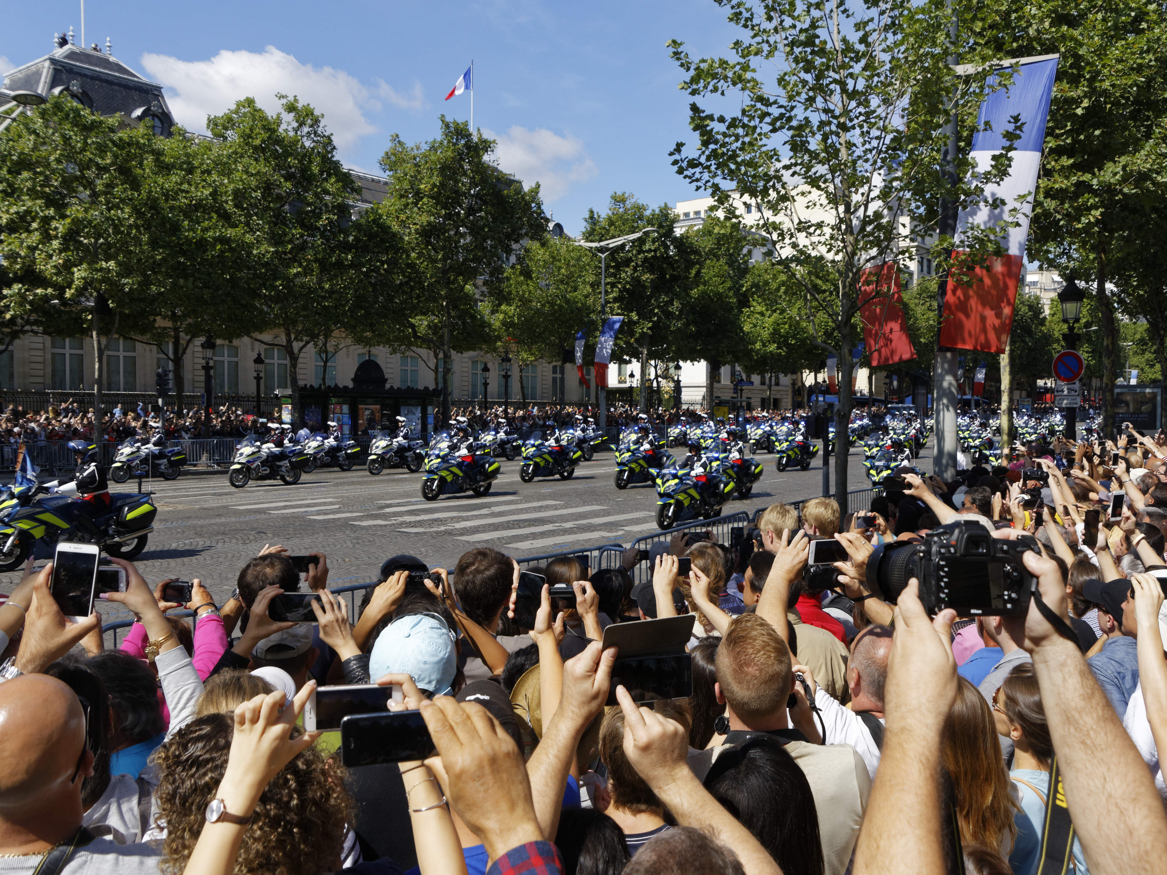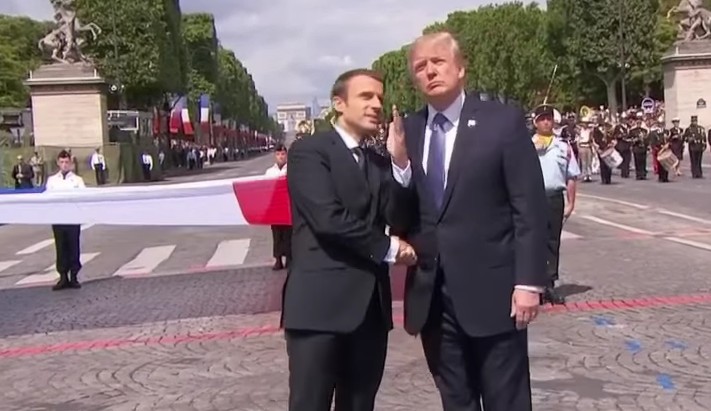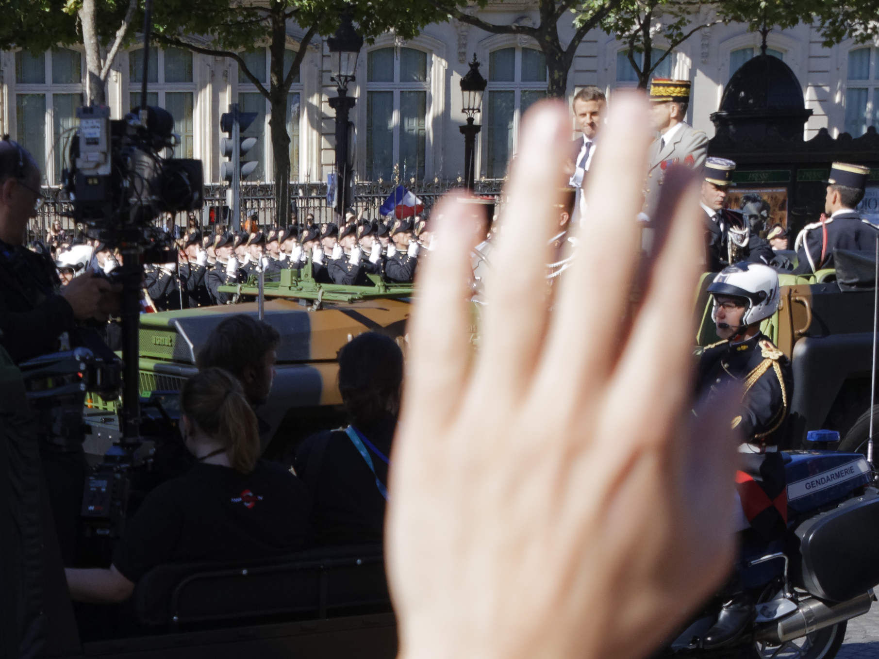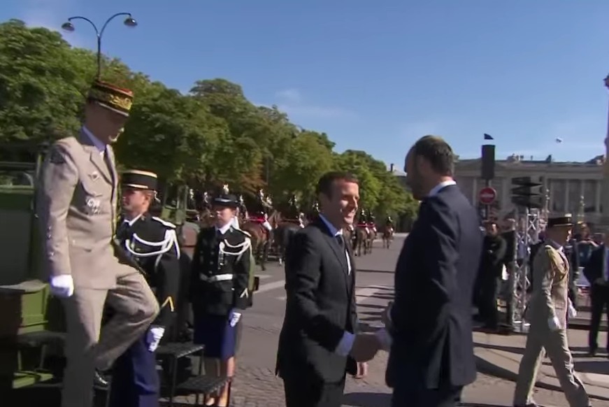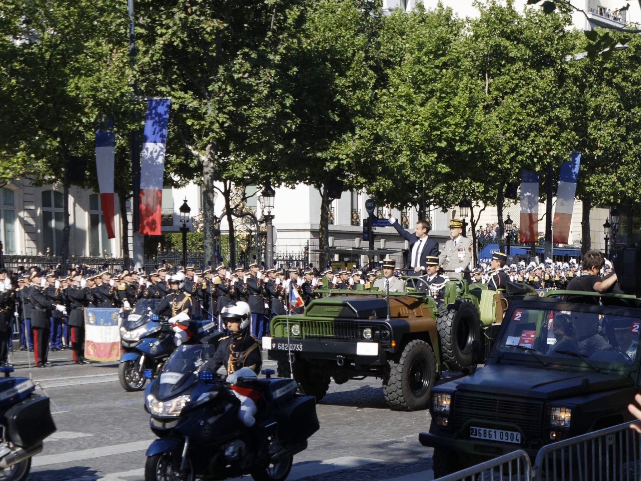 Précédé des cavaliers de la garde républicaine et entouré de motards de la gendarmerie, le chef de l’Etat, debout sur un command-car, a ensuite rejoint la tribune présidentielle place de la Concorde, où se trouvait le président des Etats-Unis, Donald Trump.