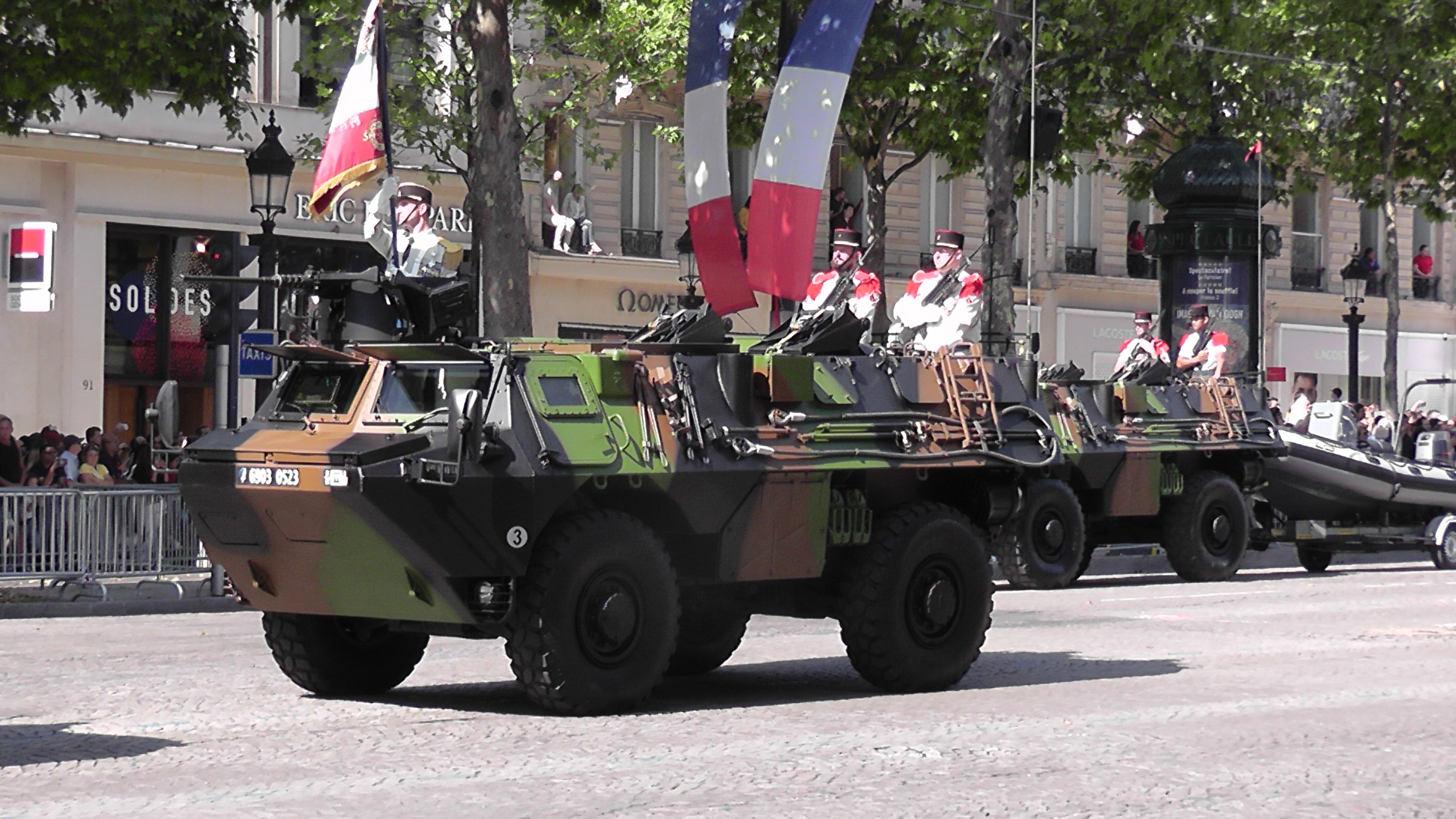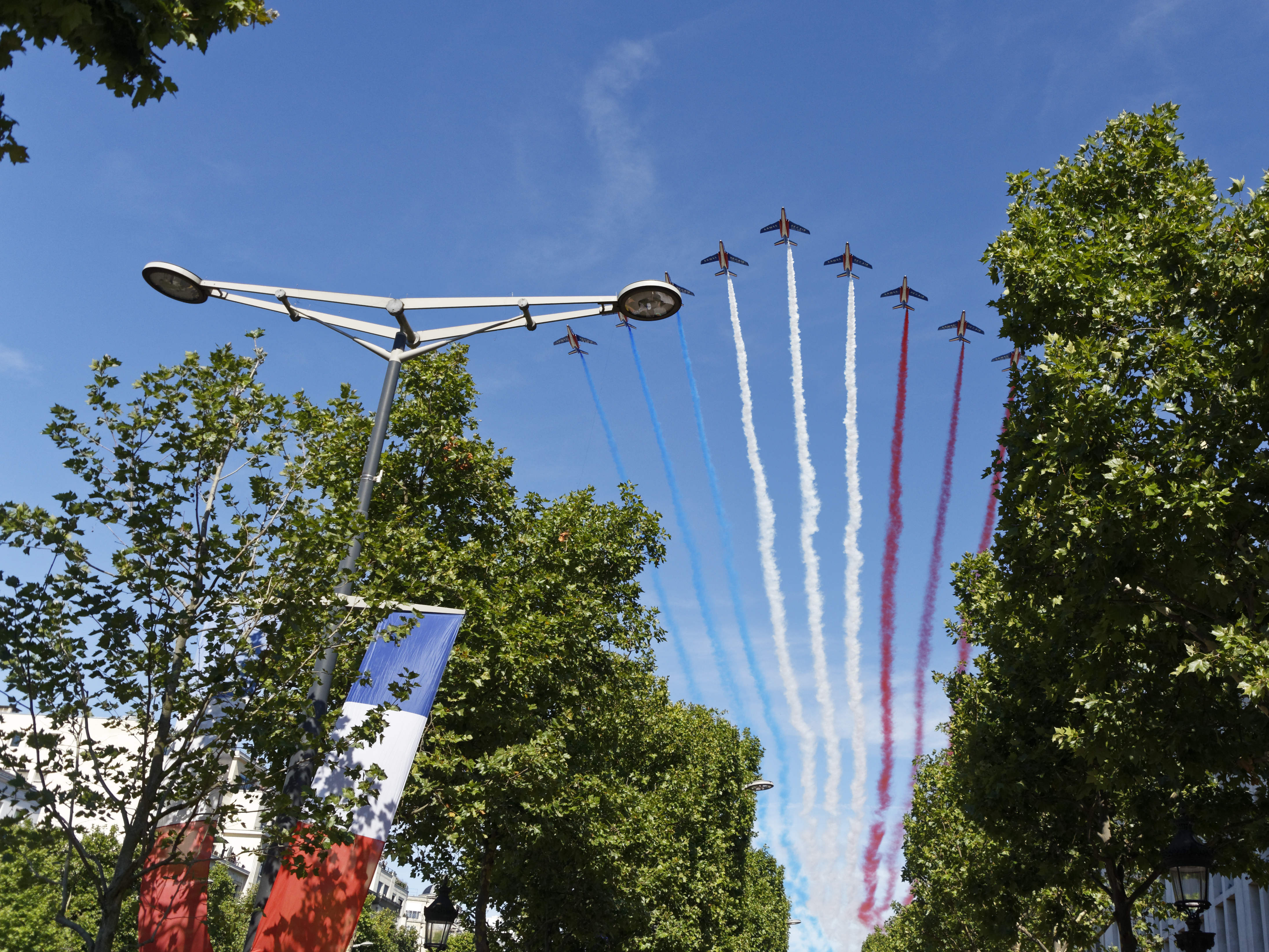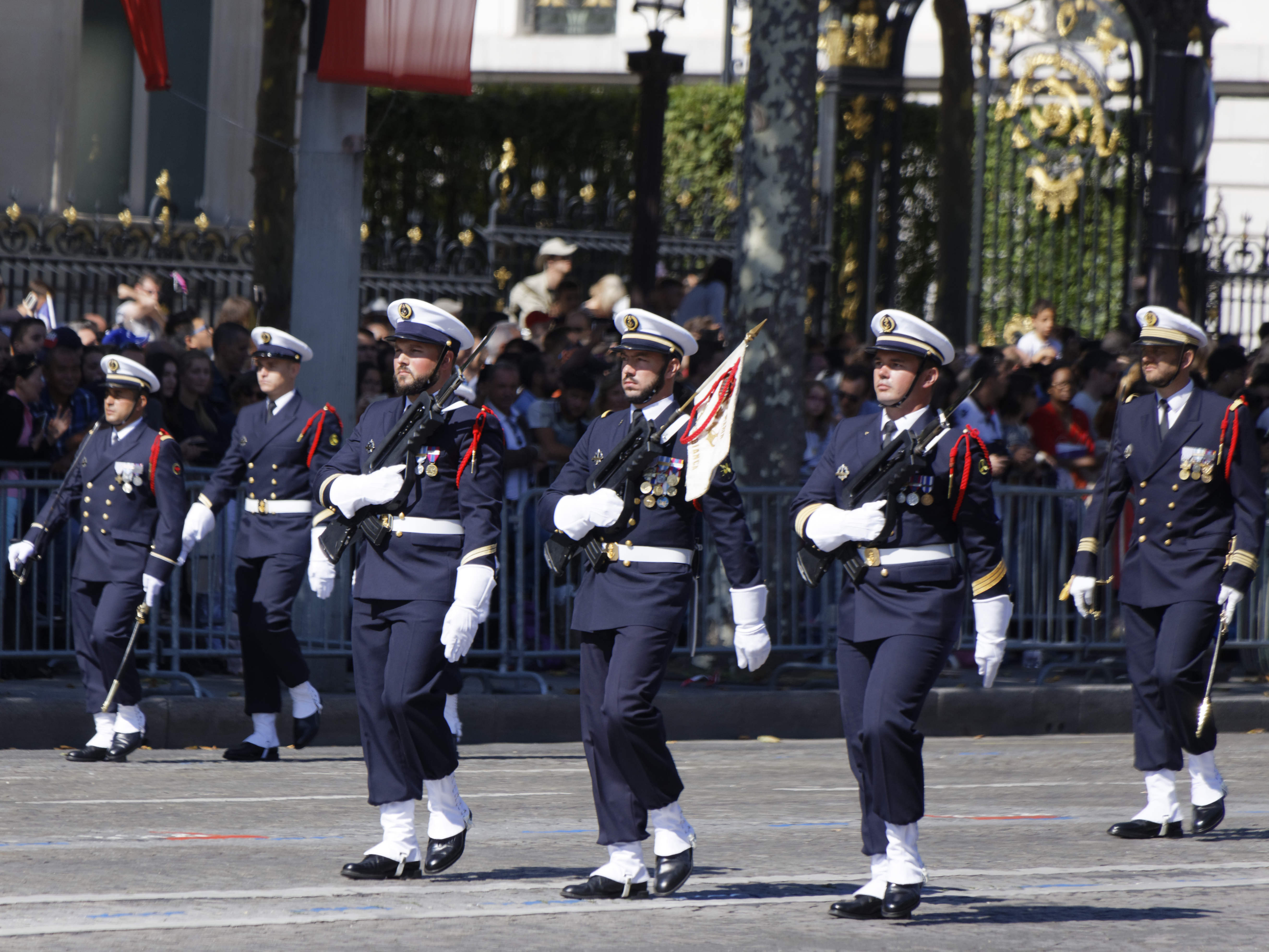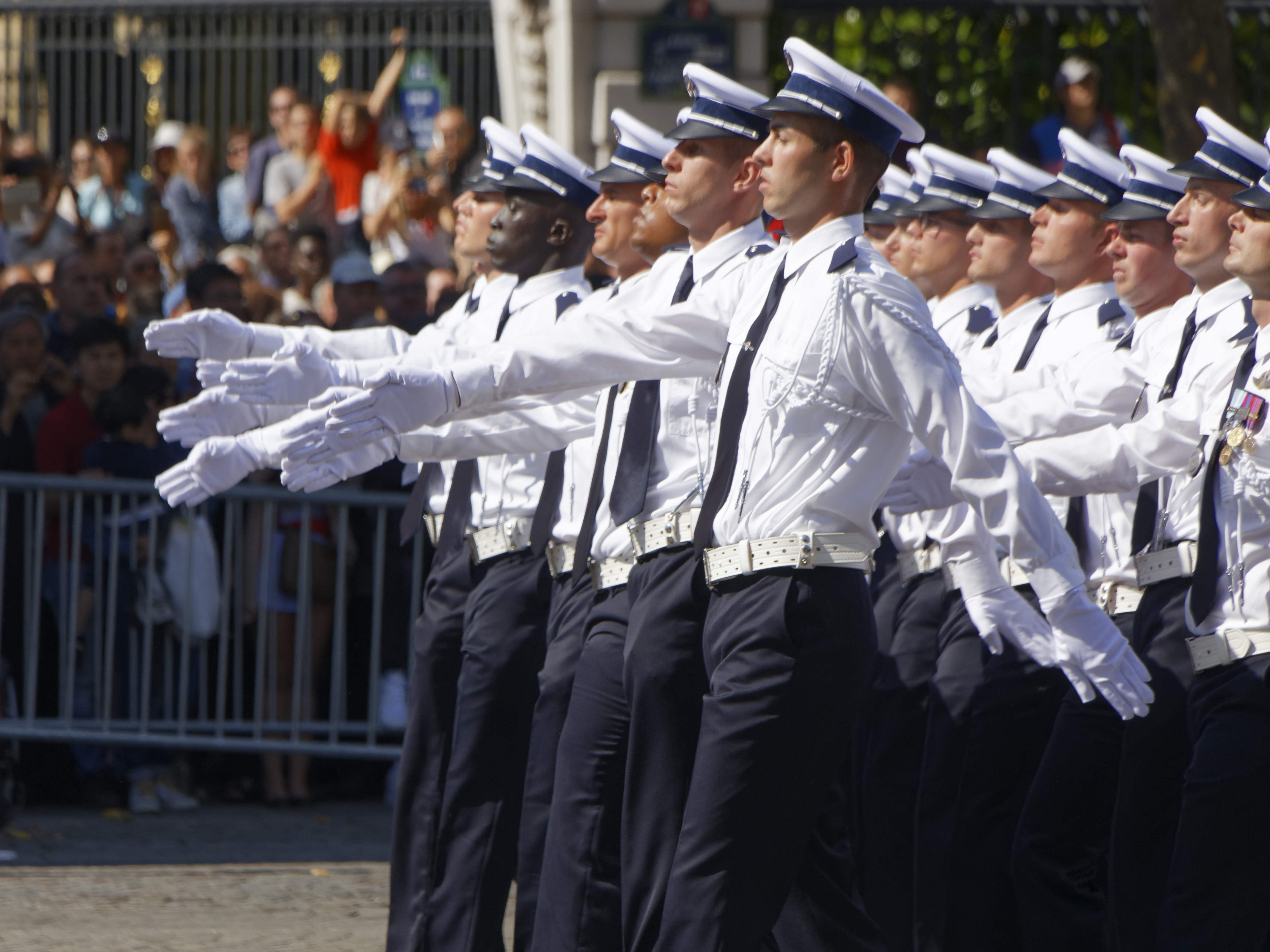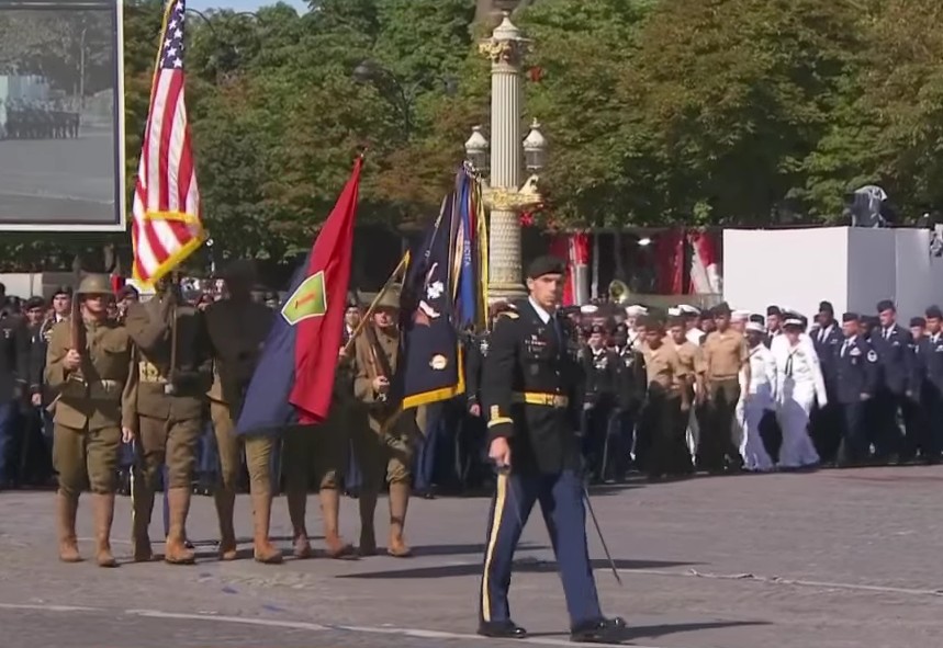 La patrouille acrobatique de l’US Air Force et deux avions de chasse furtifs américains F-22 ont ouvert le bal aérien du défilé au côté de la Patrouille de France, vivement applaudie par Donald Trump. Puis, en uniformes d’époques, cinq « Sammies » – surnom des soldats de l’Oncle Sam engagés dans la Première Guerre mondiale – ont pris le relais, ouvrant à leur tour la marche des troupes au sol, avant le passage d’un détachement américain interarmes.