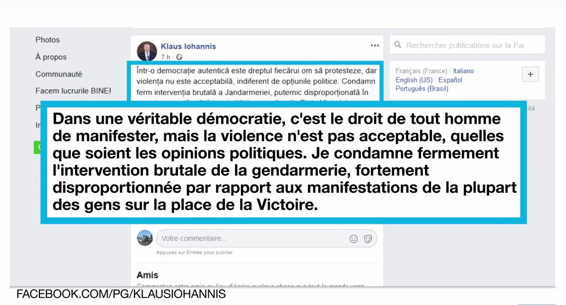 Le président centriste Klaus Iohannis a condamné la violence excessive dont la police a selon lui fait preuve. « Je condamne fermement l’intervention brutale de la police anti-émeutes, totalement disproportionnée par rapport aux actions de la majorité [des manifestants] », a-t-il écrit sur sa page Facebook. « Le ministère de l’Intérieur doit s’expliquer rapidement sur la manière dont ont été gérés les événements de la soirée », a-t-il ajouté.