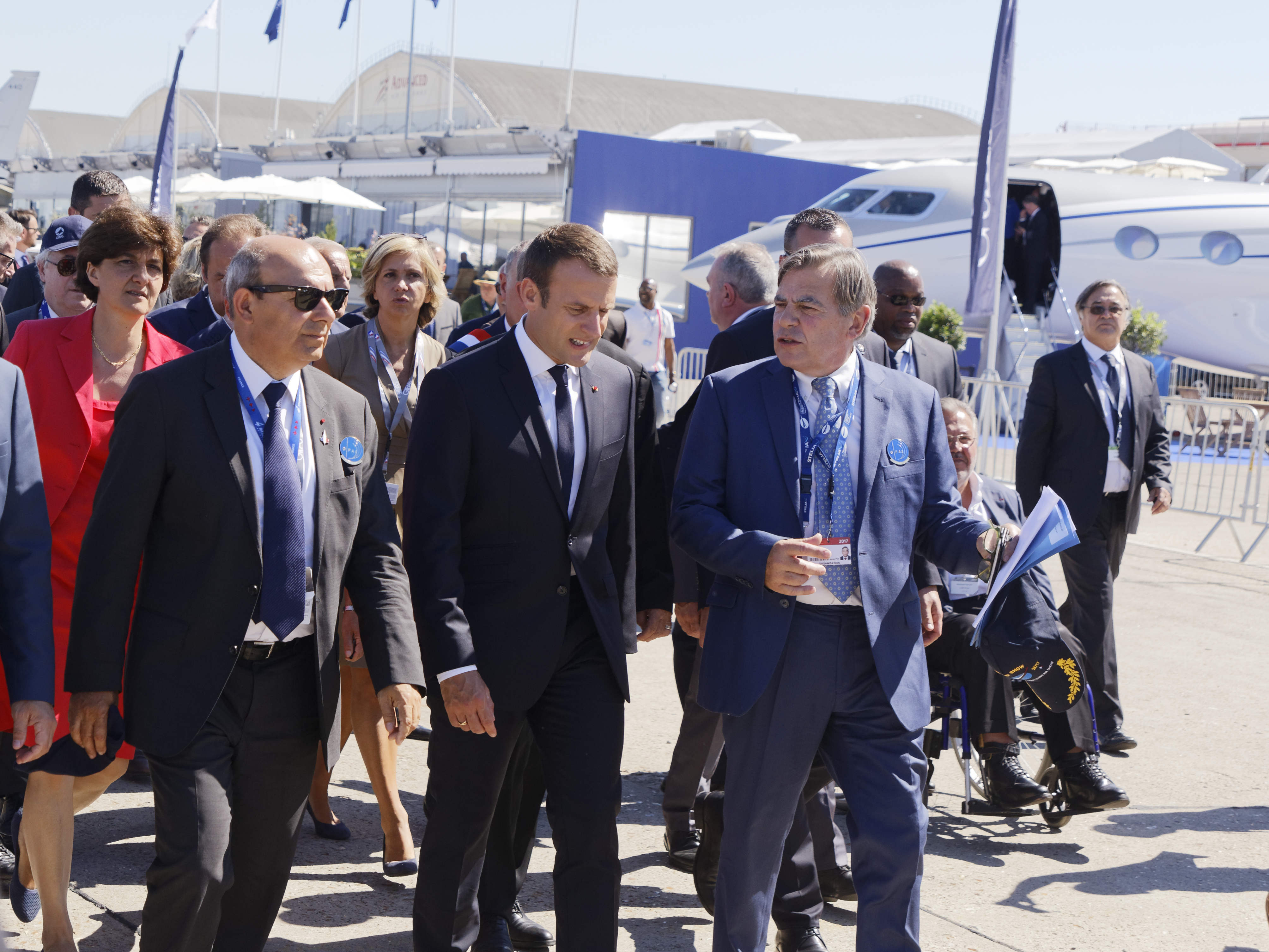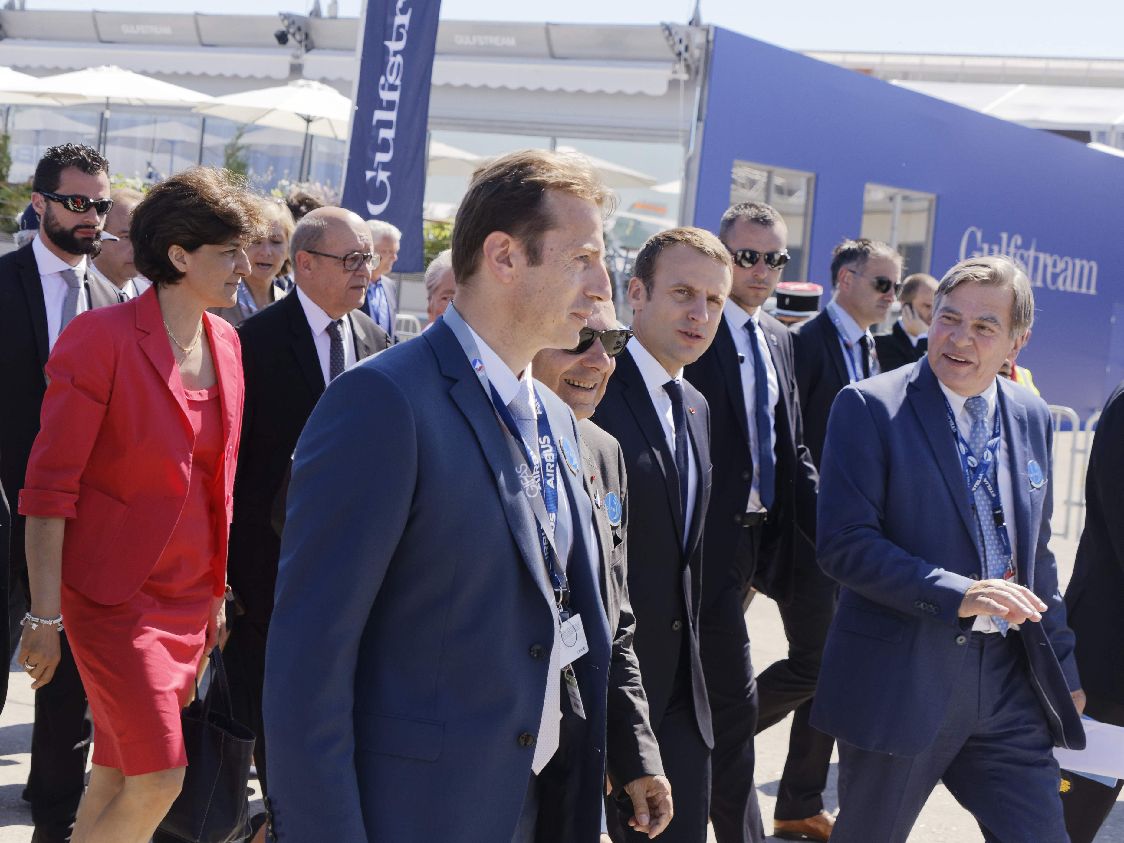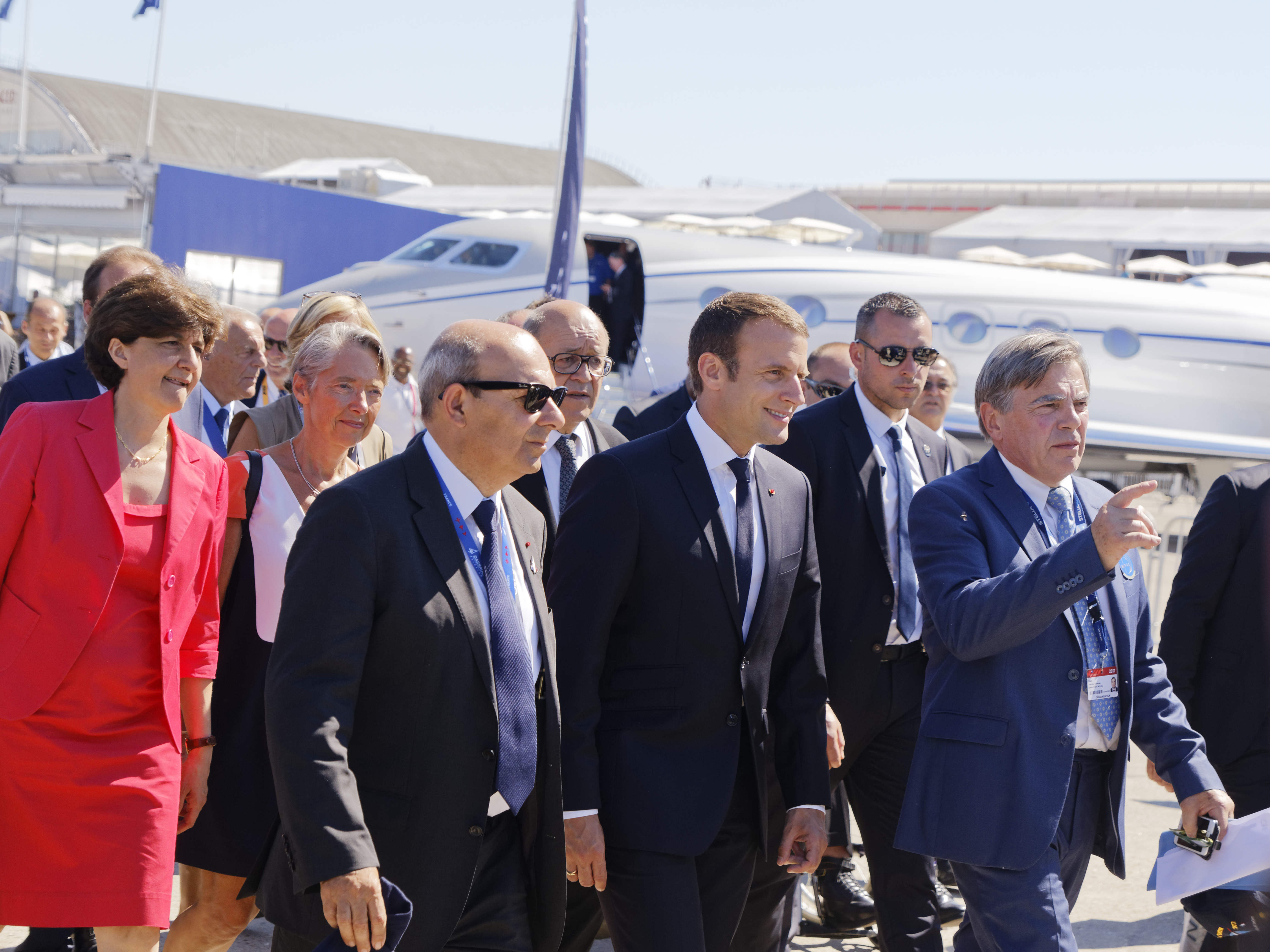 Dans l’avion, il avait à ses côtés une vingtaine de salariés et de dirigeants d’entreprises françaises du secteur, grand contributeur au commerce extérieur de la France. Ainsi que la ministre de la Défense Sylvie Goulard et la ministre des Transports Elisabeth Borne. La délégation a assisté ensuite à un défilé aérien, avec notamment l’avion très gros porteur A380, l’avion d’affaires Falcon de Dassault Aviation et des hélicoptères militaires de production européenne, Caïman (NHIndustries NH90) et Tigre (Eurocopter EC665).