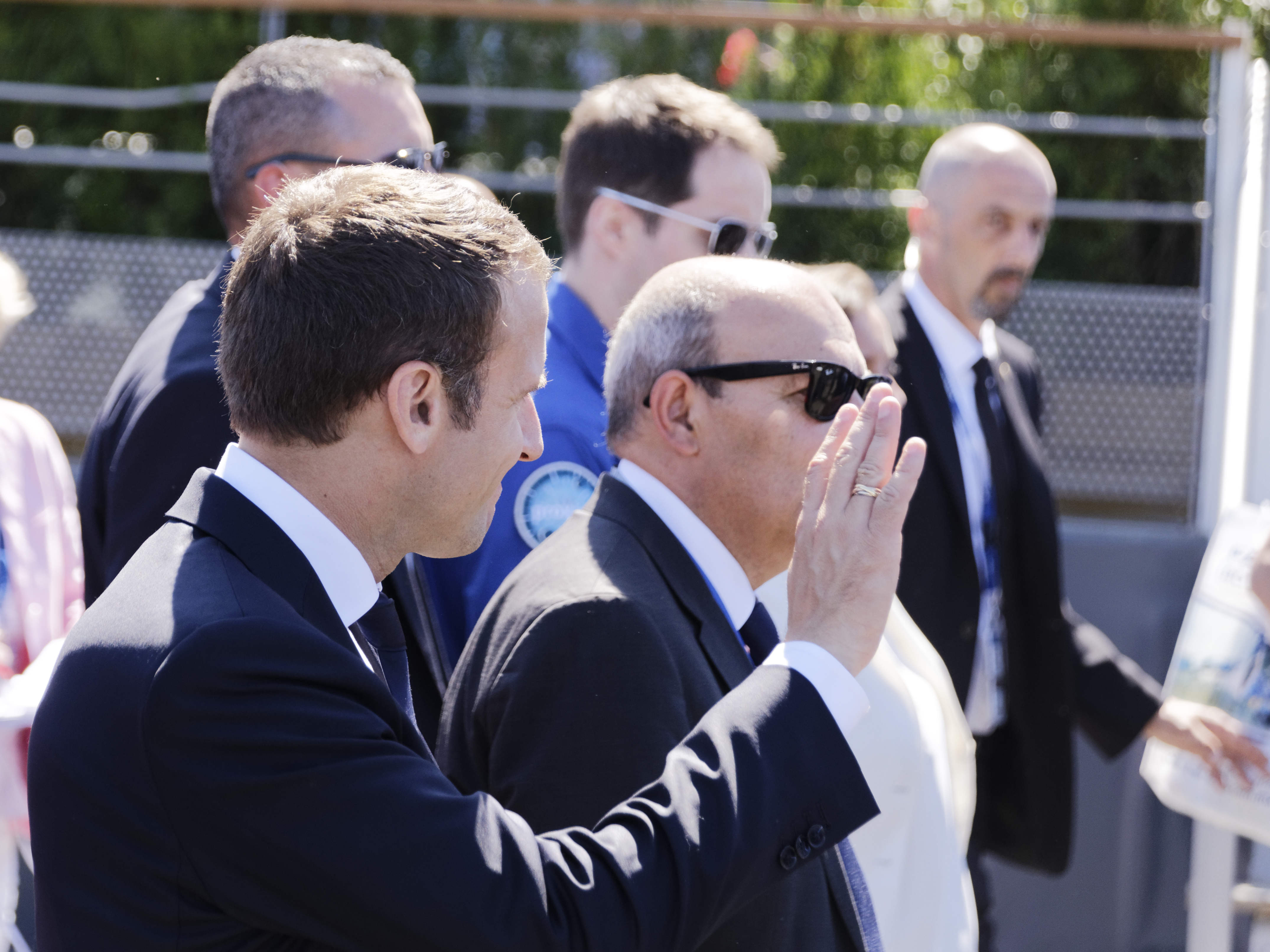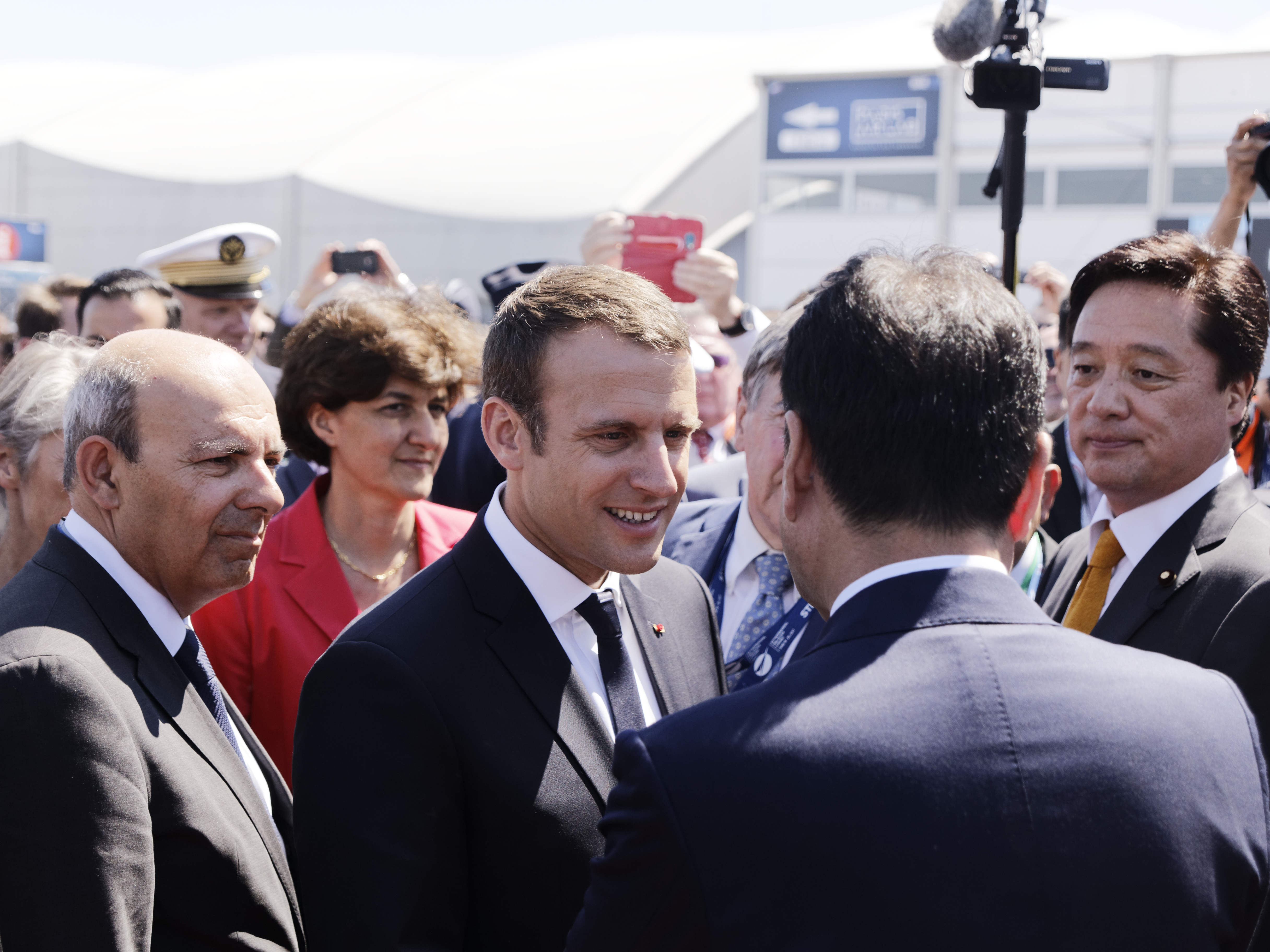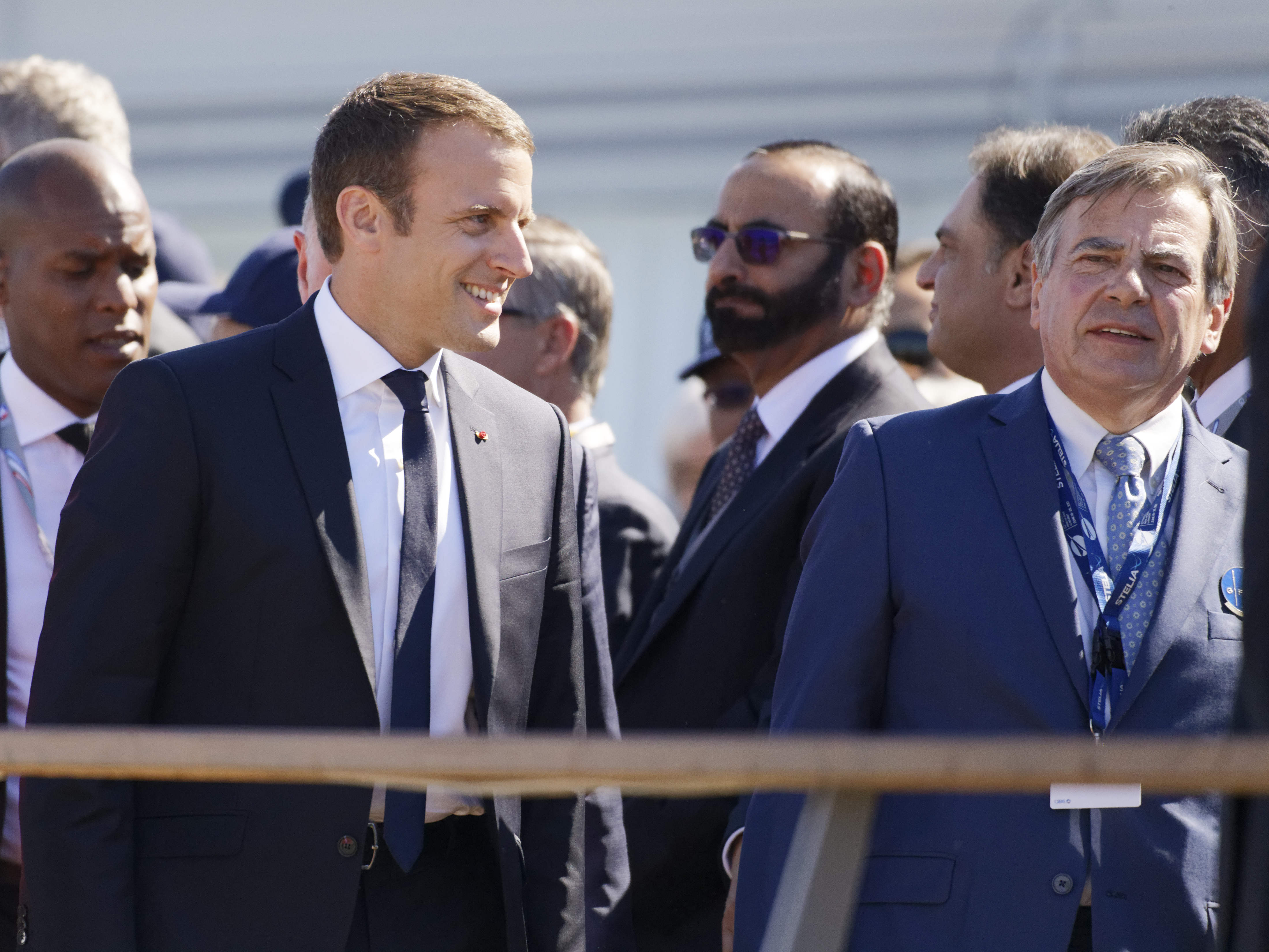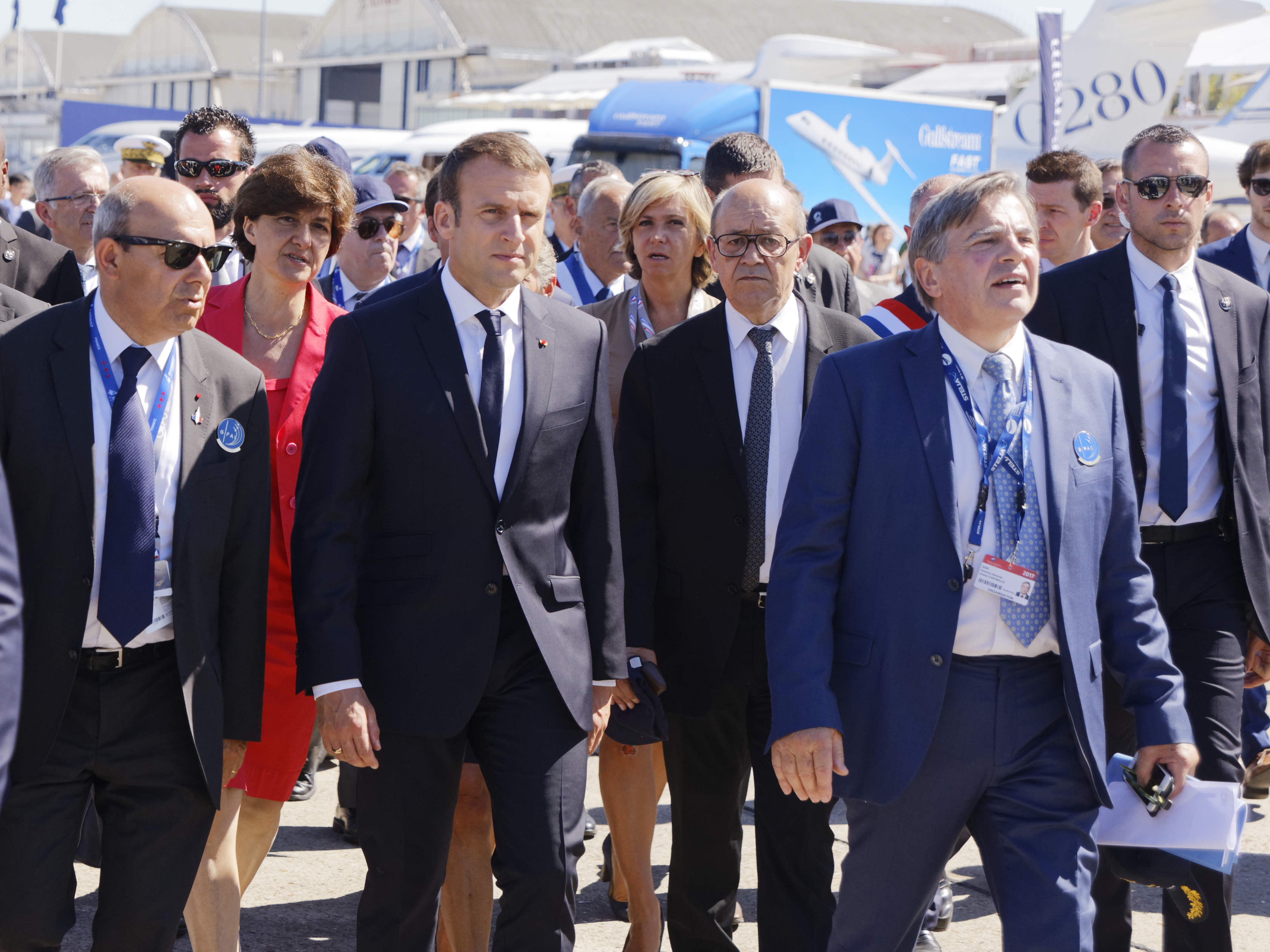 Dans l’avion, il avait à ses côtés une vingtaine de salariés et de dirigeants d’entreprises françaises du secteur, grand contributeur au commerce extérieur de la France. Ainsi que la ministre de la Défense Sylvie Goulard et la ministre des Transports Elisabeth Borne. La délégation a assisté ensuite à un défilé aérien, avec notamment l’avion très gros porteur A380, l’avion d’affaires Falcon de Dassault Aviation et des hélicoptères militaires de production européenne, Caïman (NHIndustries NH90) et Tigre (Eurocopter EC665).