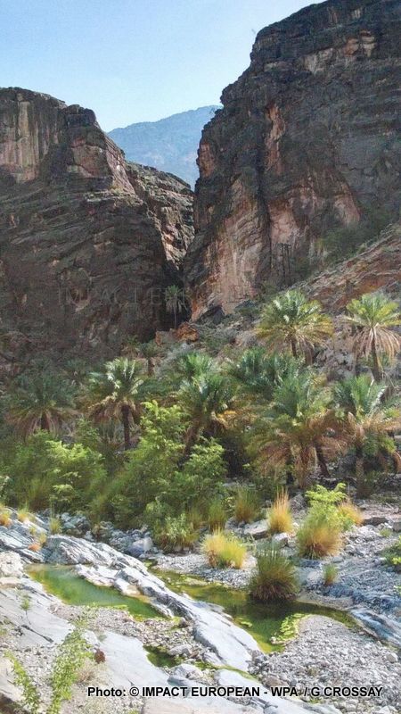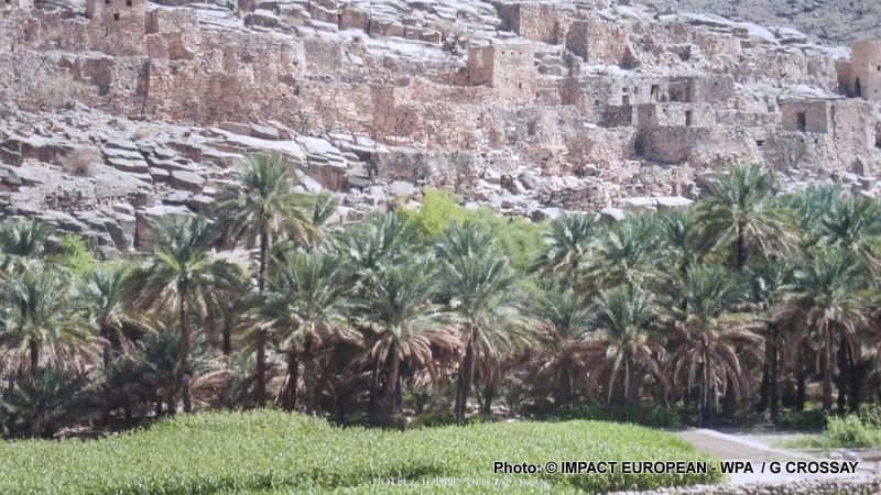 Dans les montagnes, de nombreuses oasis cultivent palmiers-dattiers et orangers en terrasses en utilisant les eaux souterraines et des systèmes de canaux ou « falajs ».