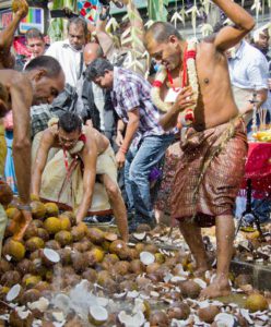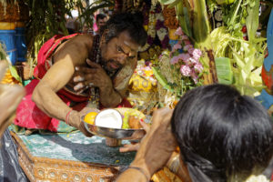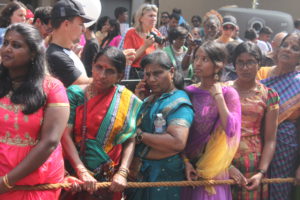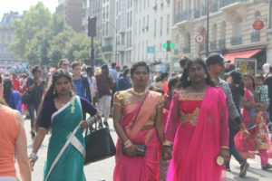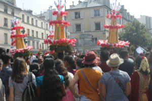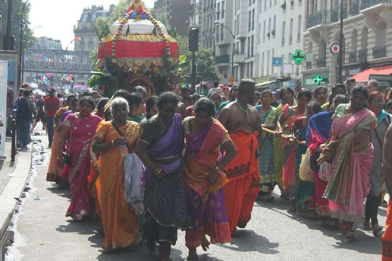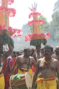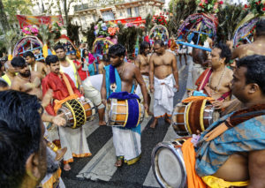 Selon les pays, les défilés sont différents ainsi que la date de l’événement. Cette année à Paris, elle s’est déroulée le 27 août sous haute sécurité et le parcours a été raccourci, mais le départ a eu lieu du Temple Sri Manicka Vinayakar Alayam pour ensuite déambuler dans le quartier de la Chapelle. Des milliers d’hindous et de parisiens ont communié ensemble dans les vapeurs de la fête dédiée au dieu enfant à tête d’éléphant. Le soleil était au rendez-vous, le parfum de safran, de jasmin enroulé en colliers et l’encens embaumait l’atmosphère du défilé qui a vu se succéder des chars enrubannés, des danseurs pieds nus à plumes de paon et des musiciens en transe marchant sur les noix de coco fracassées signifiant que l’on donne son coeur à Ganesh.