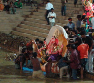 Ganesh Chaturthi a été fêté en Inde le 25 août et c’est une des plus importantes fête du pays particulièrement dans le Maharashtra ( Mumbai-Bombay) et à Chennai- Madras, elle dure dix jours au total. A cette occasion, des statues en plâtre de toutes tailles représentant le dieu à tête d’éléphant fils de Shiva et Parvati sont portées dans des processions et finissent immergées. A Bombay, elles sont de taille gigantesque et de prix très élévé. Elles finissent à Chowpatty Beach afin d’y être immergées. Avant cela, elles avaient été rapportées dans les maisons où les fidèles les ont adorées et priées pendant une dizaine de jours et avaient allumé des petites lanternes de terre cuite ( diyas). Les plus belles tenues aux couleurs chatoyantes sont de rigueur).