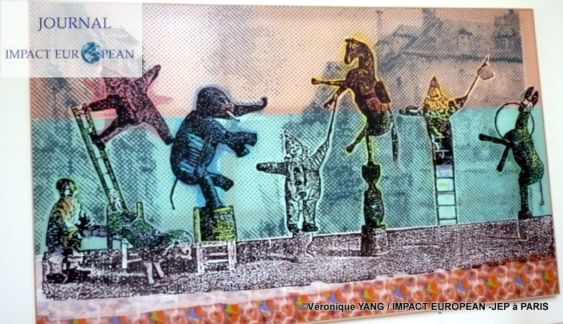 -Dès l’entrée dans la chapelle, les oeuvres de Sigmar Polke, artiste allemand né en Silésie (Pologne) en 1941 et décédé à Cologne en 2010, nous introduisent dans le thème du divertissement et du cirque. Fondateur du « Réalisme capitaliste » en référence au « Réalisme socialiste », (art officiel de l’Union soviétique), il utilise des tissus imprimés comme support et expérimente de nouvelles techniques mêlant, les pigments, les composés chimiques et les solvants tout en réemployant des couleurs délaissées telles le pourpre et le lapis-lazuli. Les toiles du lauréat du »Lion d’or »à la Biennale de Venise en 1986, « Zirkusfiguren « (2005) et « Die Trennung des Mondes von den einzelnen Planeten » (2005), intégré au cycle « )Axial Age » (2007) se font face comme dans un miroir.