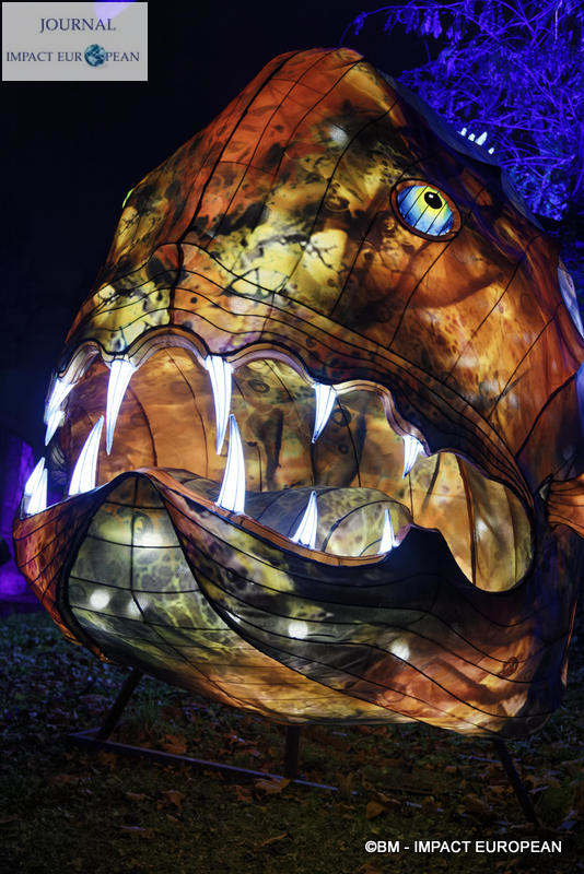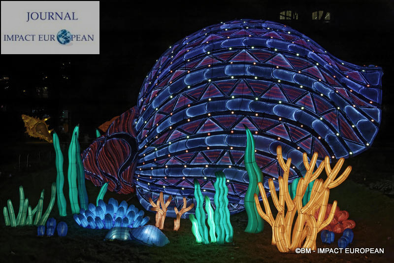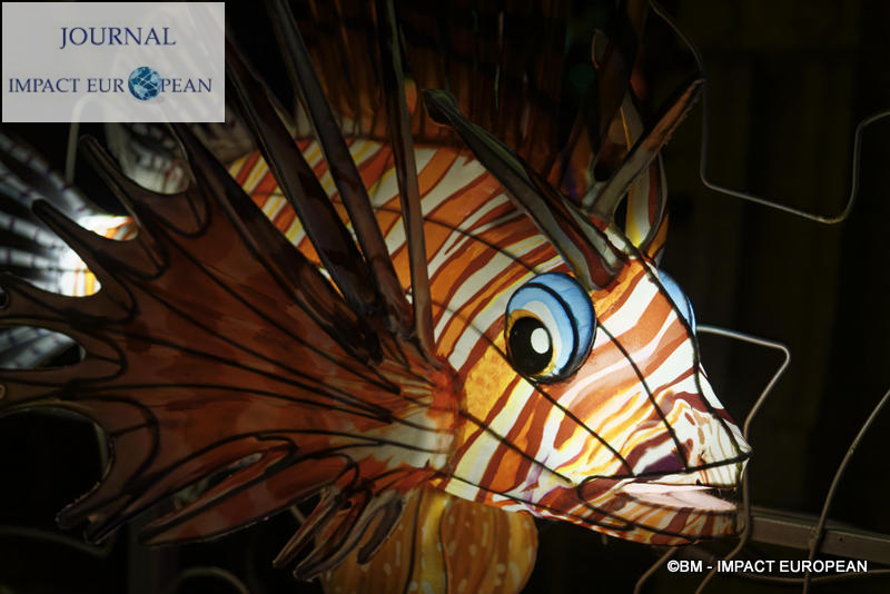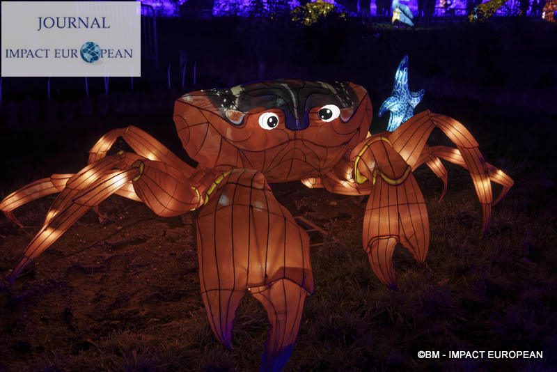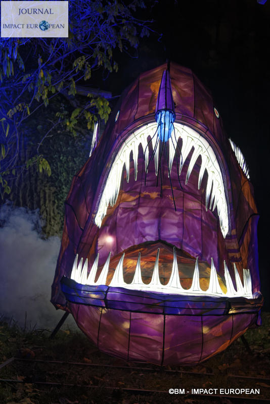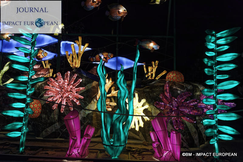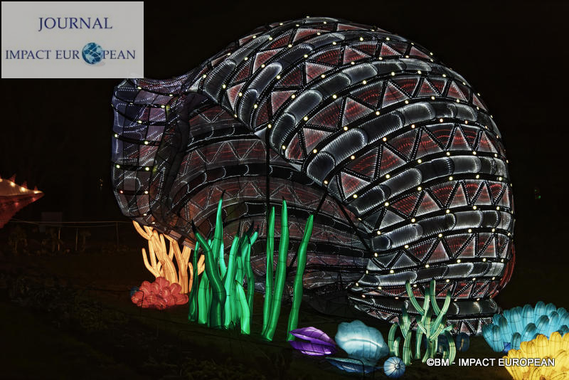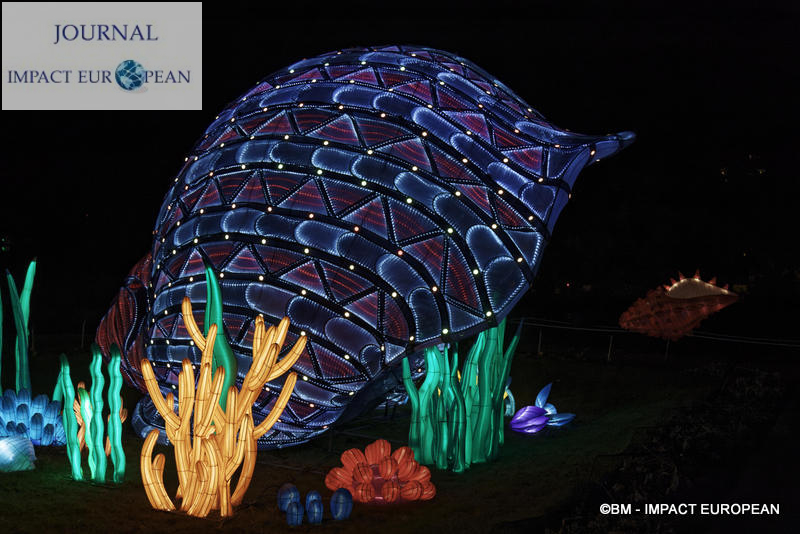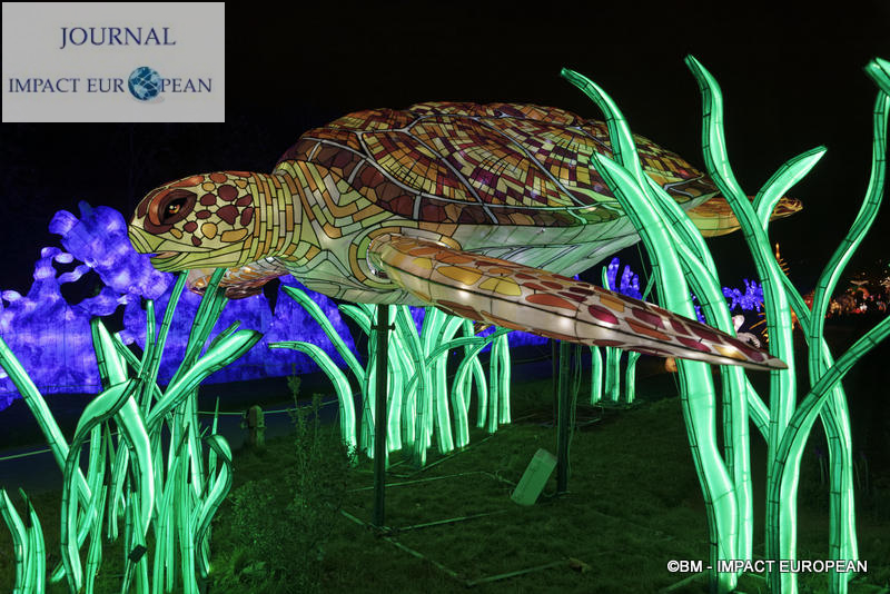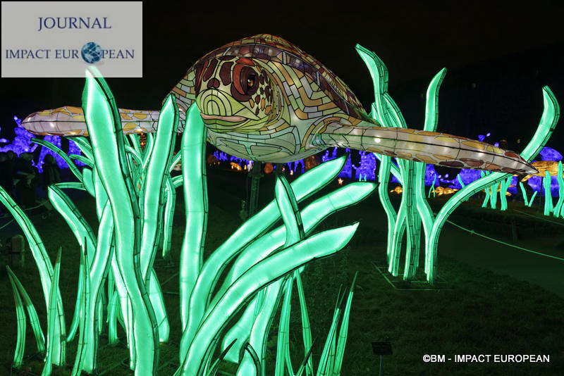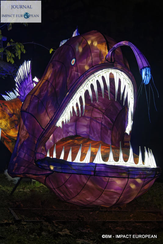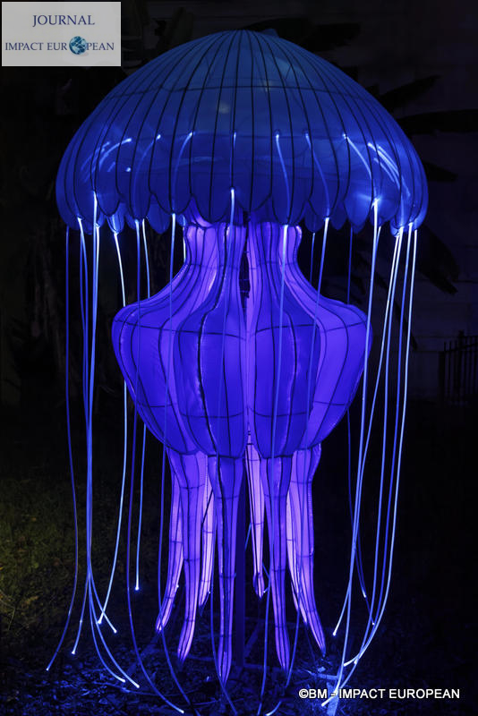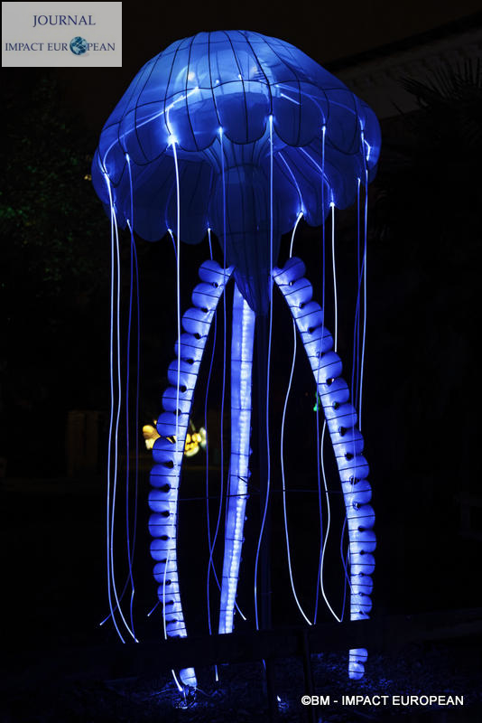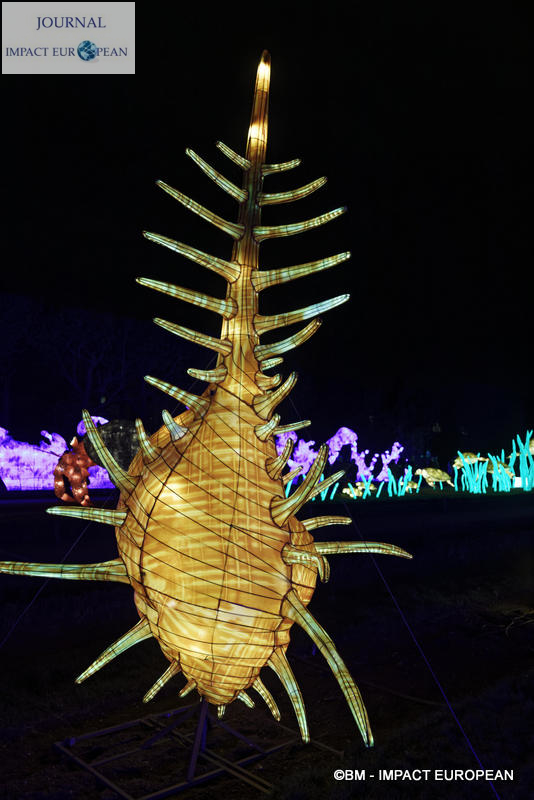 Le parcours se divise en 4 étapes marines: Promenade sur le littoral tropical et découverte de ses habitants (flamands rouges, crabes, coquillages, bernard-lhermite, pélicans thage, crocodiles, tortues marines..),Plongée en mers chaudes au milieu des algues (coraux, crevette-mante,grand requin, pieuvre…), Mystérieux abysses à la rencontre d’étranges créatures (cténophore,poisson-ogre, la baudroie abyssale) et Remontée en eaux froides vers les mers glacées des pôles ( rencontre du homard, des orques, des gorfous macaronis, du krill, des ours polaires et des morses). Dans le Jardin et la Ménagerie, 50 tableaux et plusieurs centaines de structures lumineuses dont certaines atteignent 10 mètres de haut ou 30 mètres de large surprennent les promeneurs. Le passage entre les 2 lieux d’exposition se fait dans le ventre d’un grand requin blanc, plus grand prédateur marin en voie de disparition.Pour certains, ce sera l’occasion de percer les mystères du monde marin et de rencontrer sa faune: coraux; poisson-ogre; tortues vertes, espèce menacée dès la naissance, elle est aussi la plus rapide des tortues marines, elle mesure en moyenne 1,20 mètre de long; crevettes-mantes; crabes et pour terminer la visite, les ours blancs menacés par le dérèglement climatique et la chasse.
