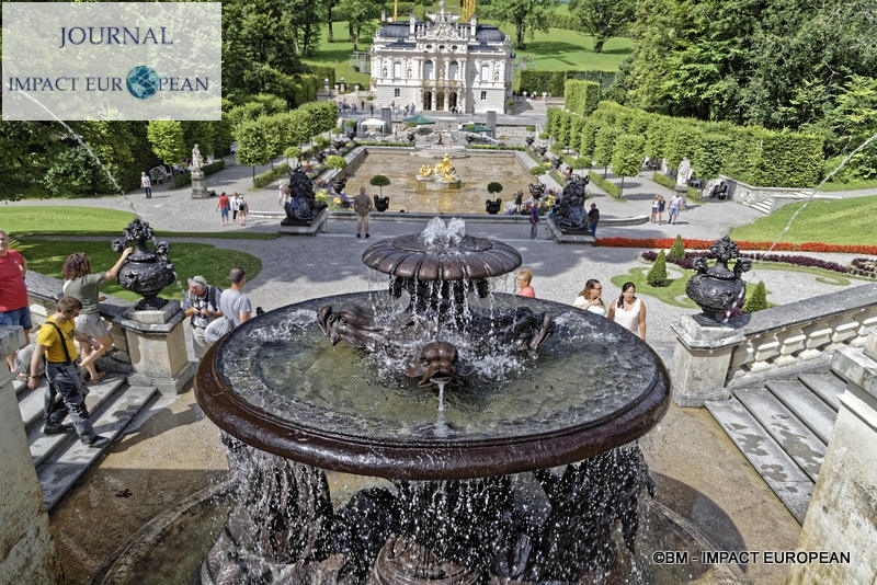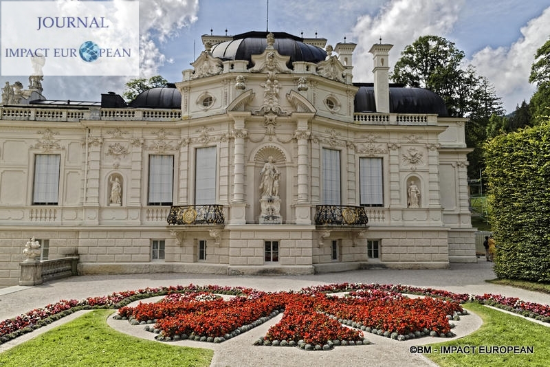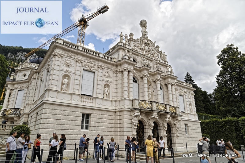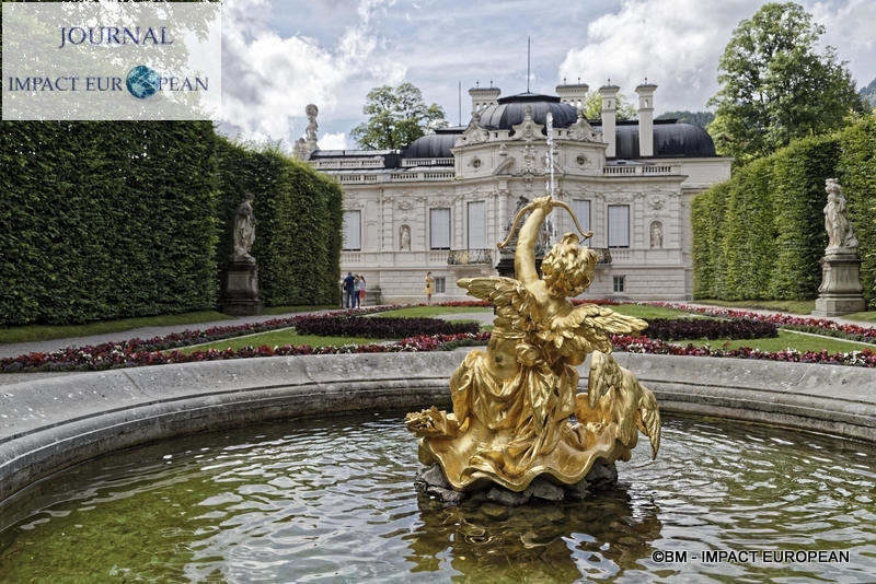 La construction du château de Linderhof, de son parc et de ses bâtiments commença en 1874 pour s’achever en 1878. Lieu préféré du roi, ce fut le seul château à être terminé de son vivant. On y trouve un style rococo du XVIIIème siècle dans le château où toutes les chambres ont une couleur différente. Tous les styles (anglais, français et italien) se retrouvent dans les jardins. Désirant reproduire la scène de « Tannhauser »,de l’opéra de Wagner, Louis II fit aménager derrière des rochers artificiels, la Grotte de Vénus », la « Grotte bleue » et la « Vallée de Cachemire » où une barque traverse une rivière souterraine. Dans le parc, le kiosque mauresque, acheté à l’Exposition Universelle de Paris et une cabane mystérieuse, la Hundighütte semblent sortir d’un autre monde.