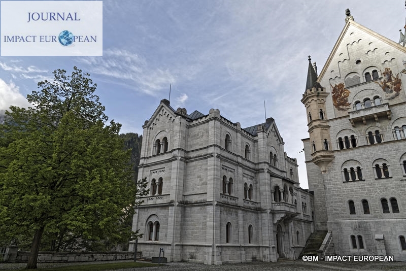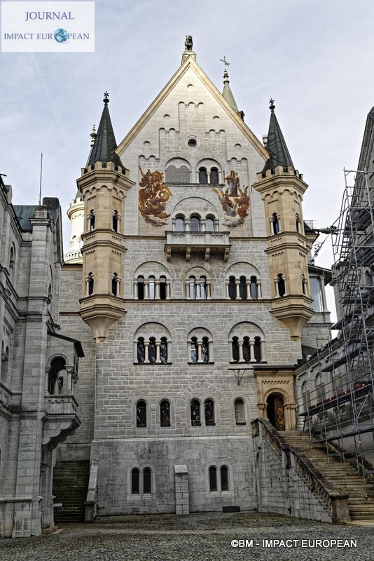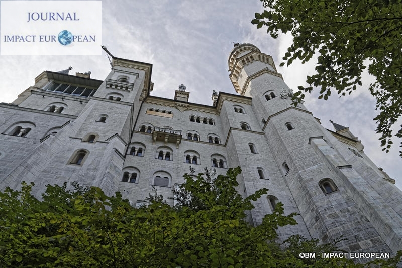 Situé sur les ruines d’un château fort face au château de Hohenschwangau où Louis II passa une grande partie de son enfance avec sa mère, le plus grand chantier du monarque fut en 1868 Neuschwanstein ( Le nouveau Rocher du Cygne), mélange de style Moyen-âgeux et de rêve. Construit d’après la restauration par Viollet le duc de Pierrefonds (France) sur un épine rocheuse de 200 mètres , il inspira Walt Disney pour le château de la Belle au bois dormant,. La décoration intérieure est basée sur un style cher au compositeur Richard Wagner et serait le lieu où apparut Lohengrin