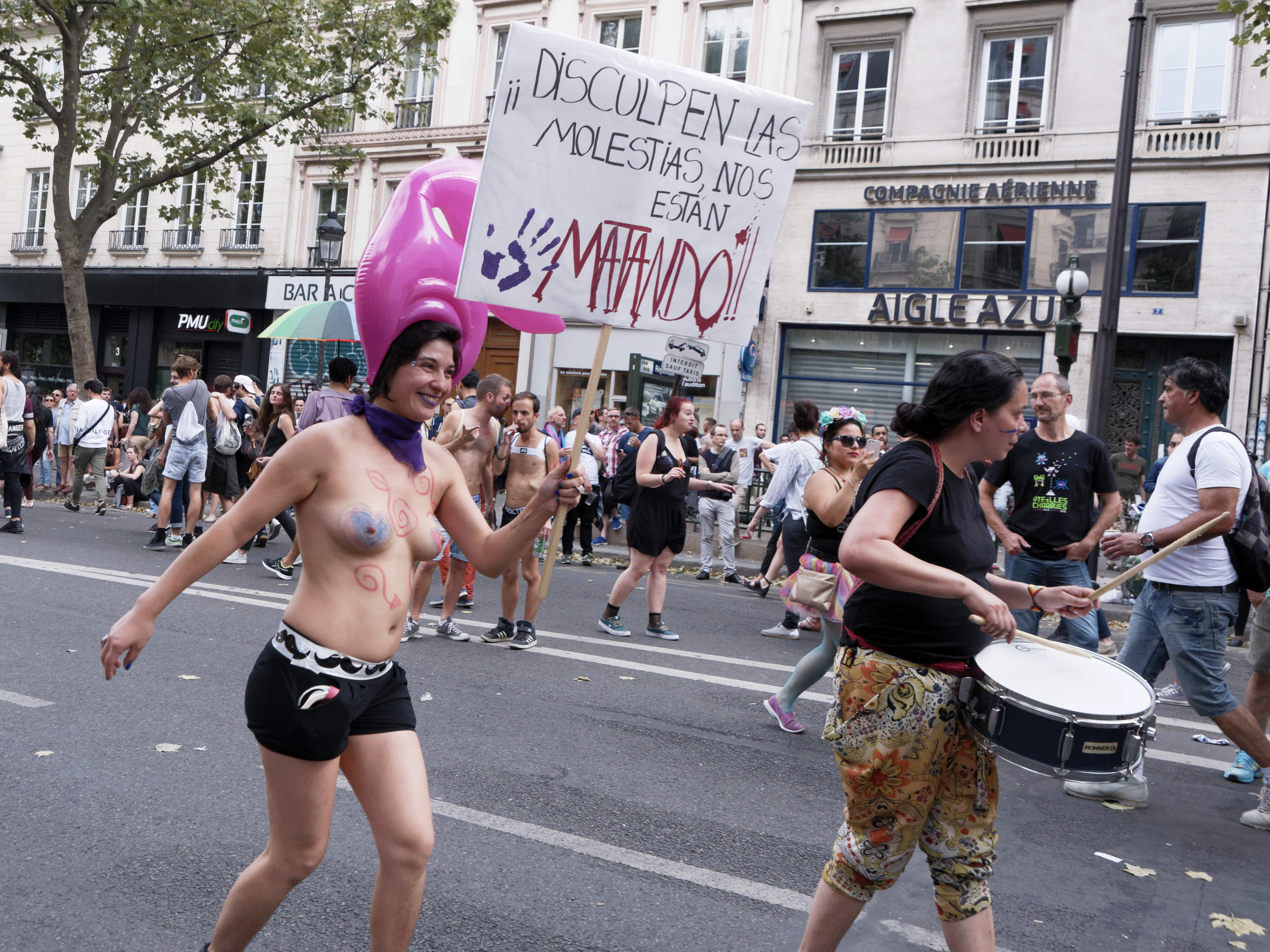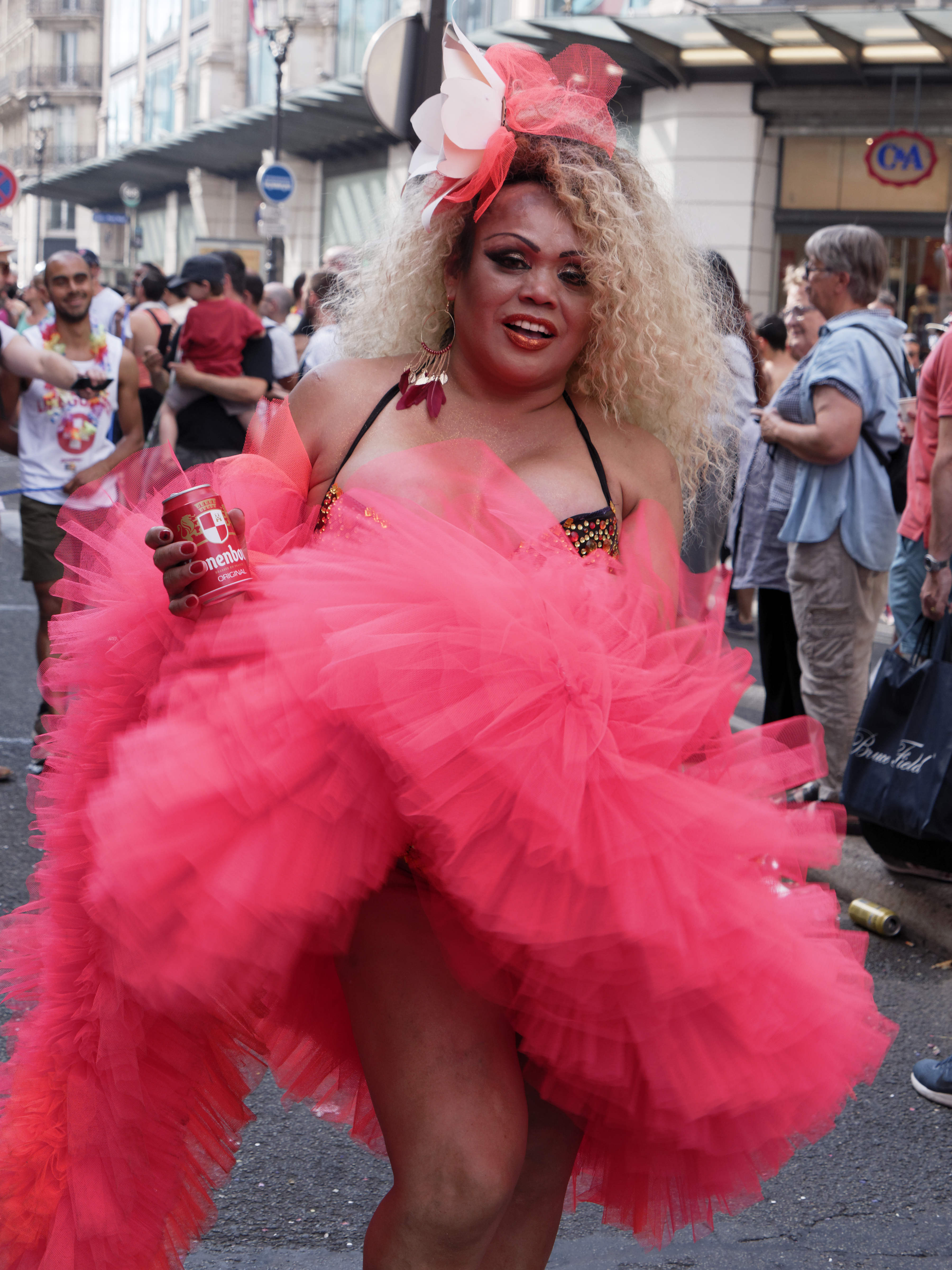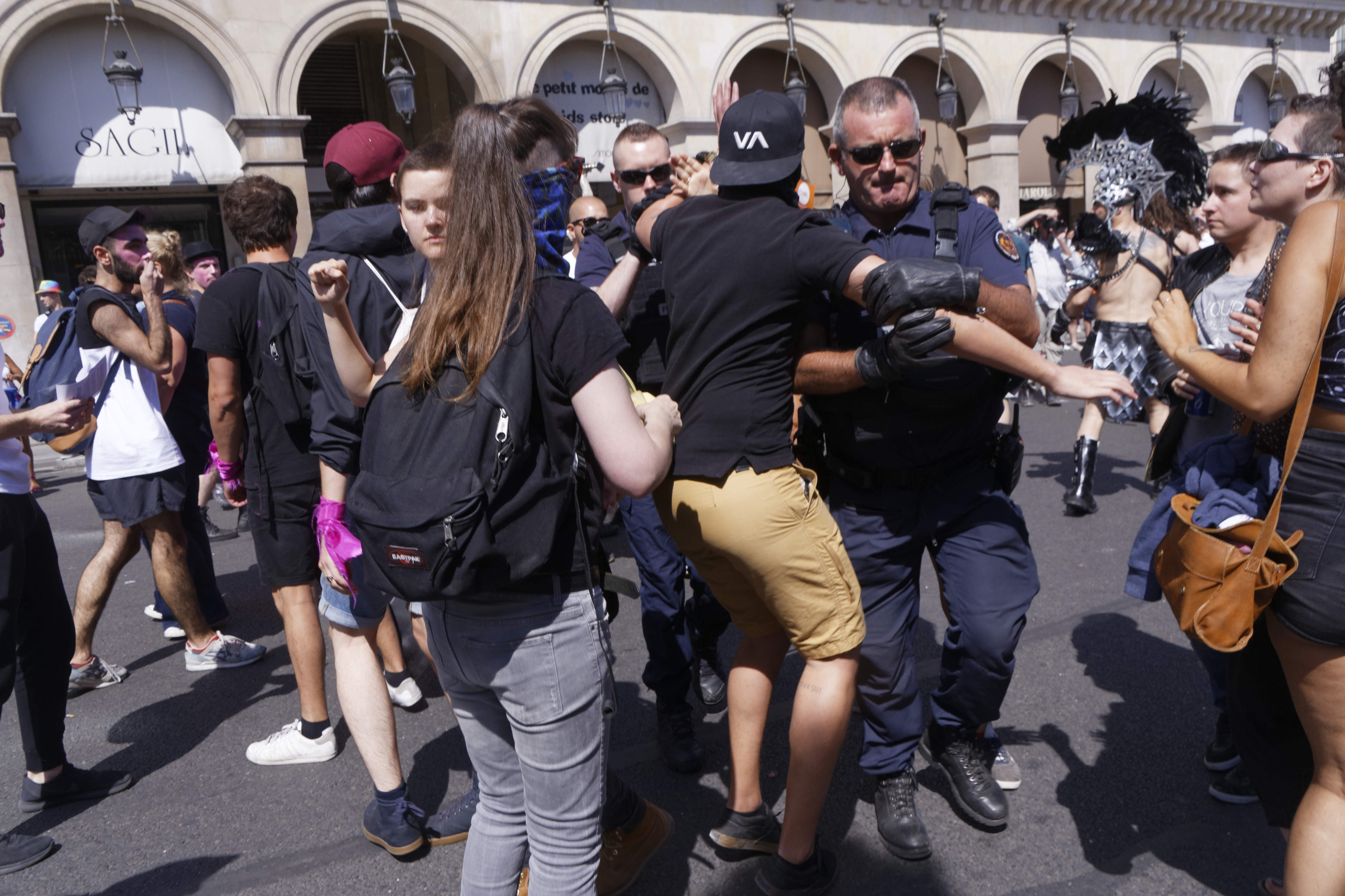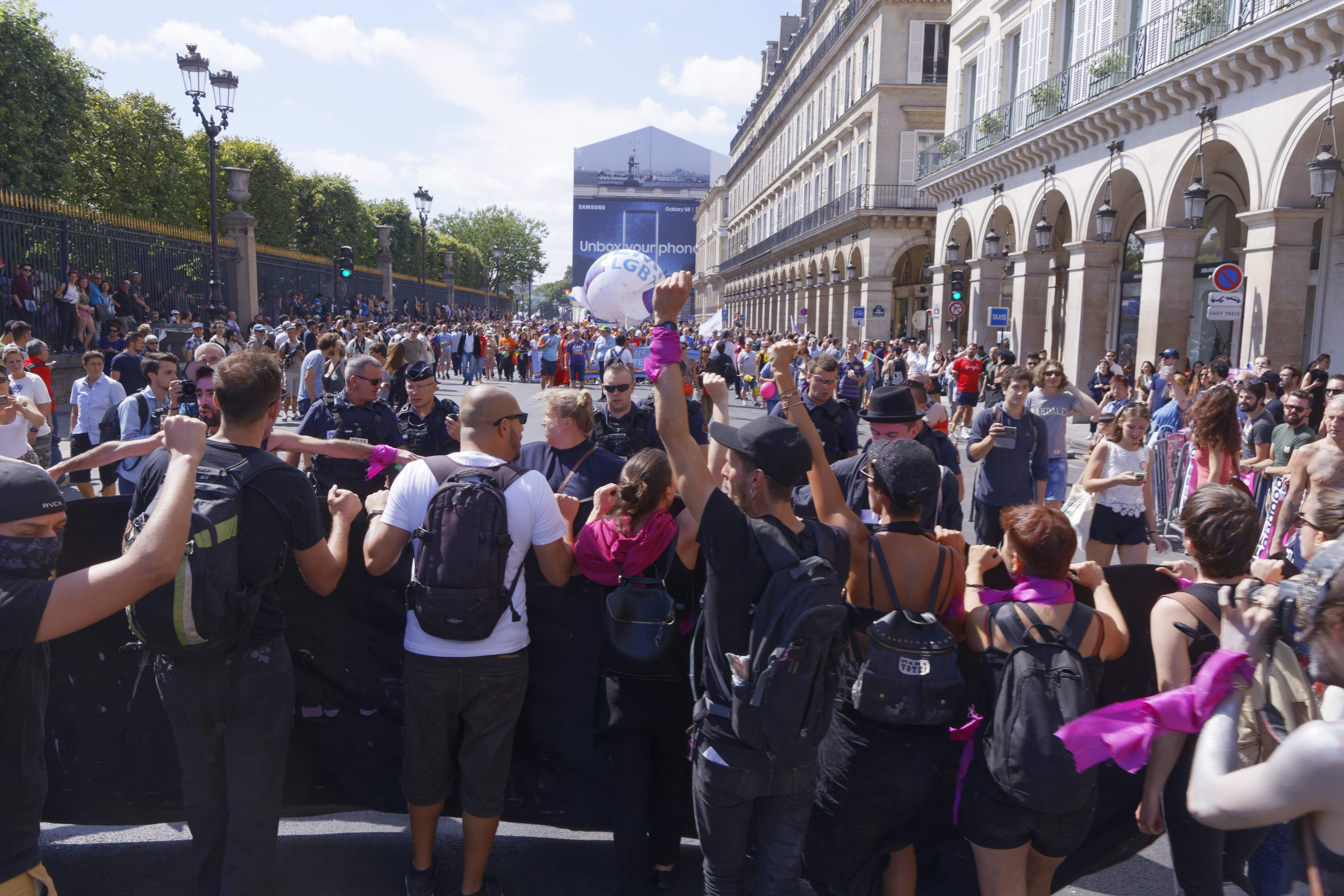 La situation s’est débloquée avec l’arrivée de CRS. Les militants radicaux ont mis fin à leur action et ont défilé devant le cortège d’En marche – LGBT, en distribuant les tracts expliquant leur zap aux passant.s.
